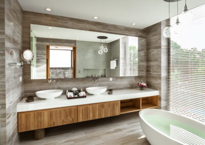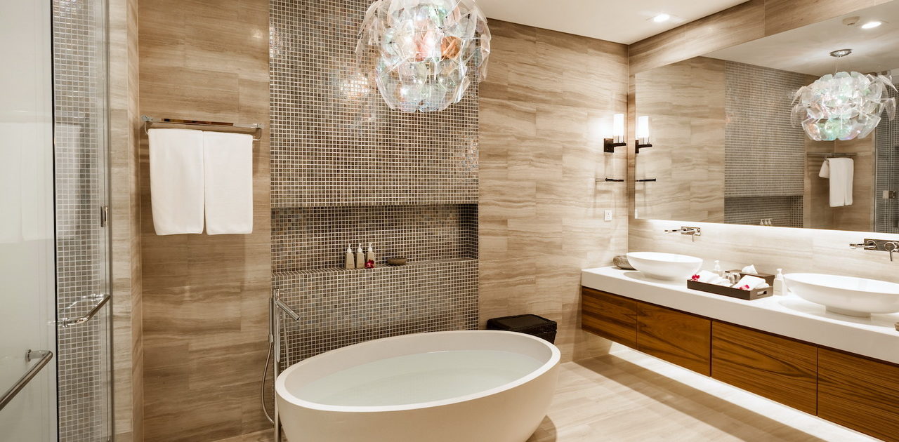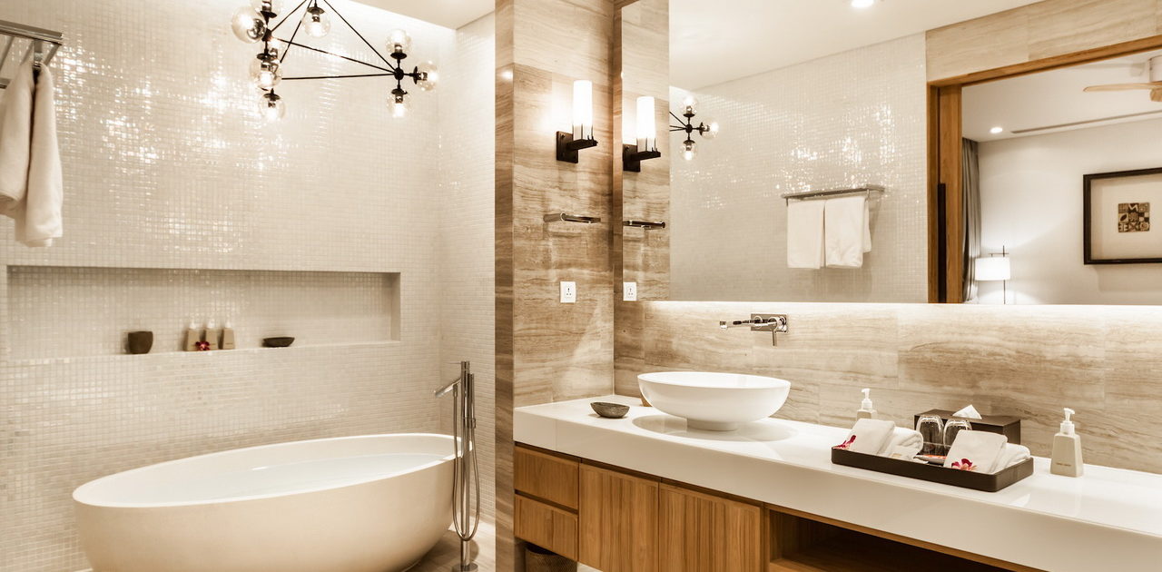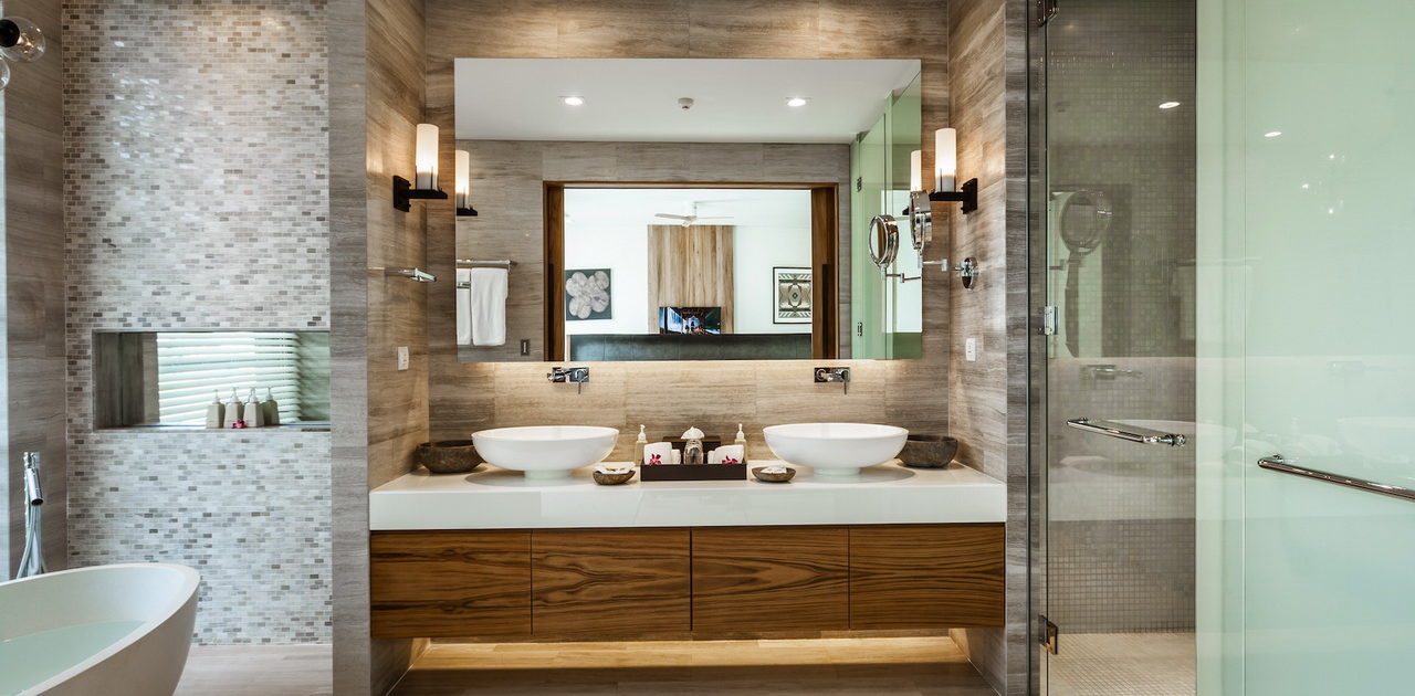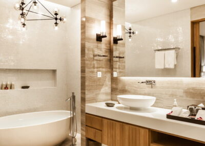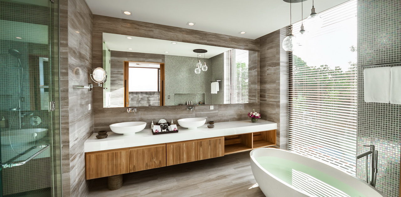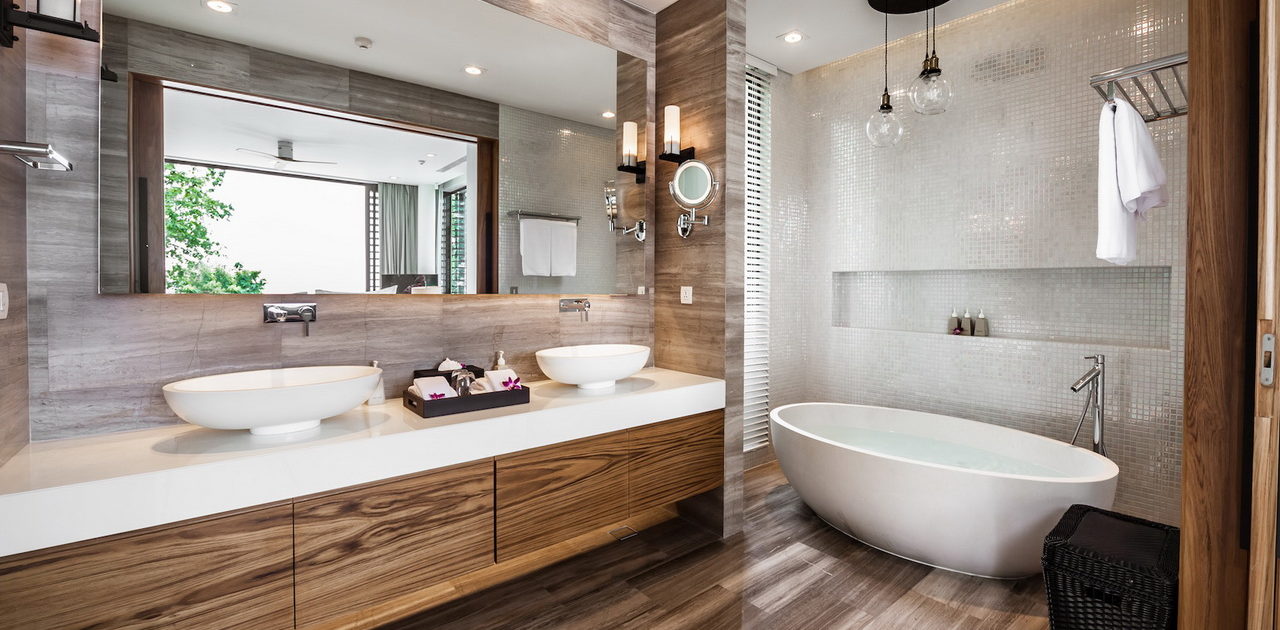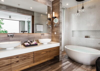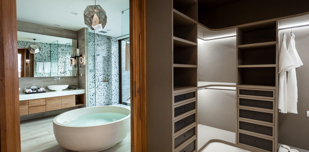Guest Bedroom 1 (60 m2) — King Size or Twin Bed, Sea View, 120 cm (50 inches) flat screen Samsung TV, Apple TV, Air-conditioning, Ceiling fan, Safety Deposit Box, Working desk with chair, His and her closet, Ensuite Bathroom with oval bathtub, Hansgrohe rain shower, double vanity, separate toilet, Toiletries, Marvel Shaving mirror, Hair dryer, Bathrobe, Slippers, Umbrella