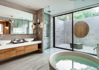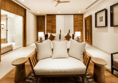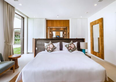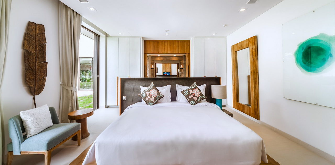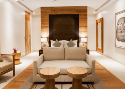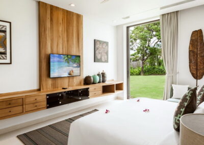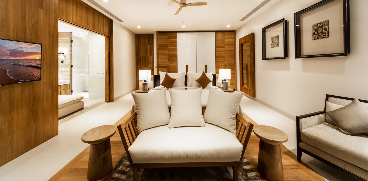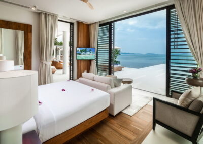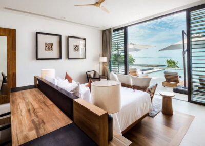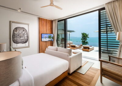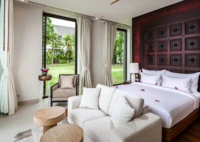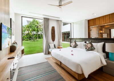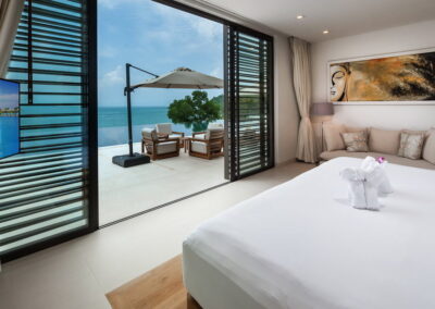 Guest Bedroom 3 (54 m2) — King Size Bed, Ocean, Pool and Garden View, 120 cm (50 inches) flat screen Samsung TV, Apple TV, His and her closet, Air-conditioning, Ceiling fan, Safety Deposit Box, 2 seater couch with two round tables, Two chairs, Ensuite Bathroom with oval bathtub, Hansgrohe rain shower, double vanity, separate toilet, Toiletries, Marvel shaving mirror, Hair dryer, Bathrobe, Slippers, Umbrella