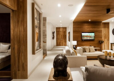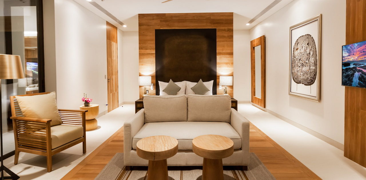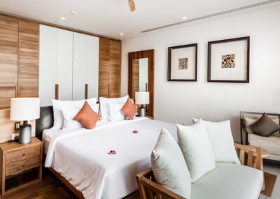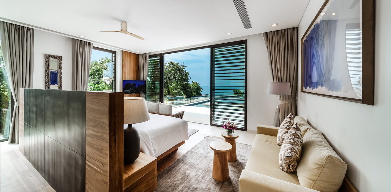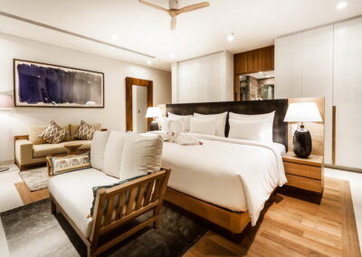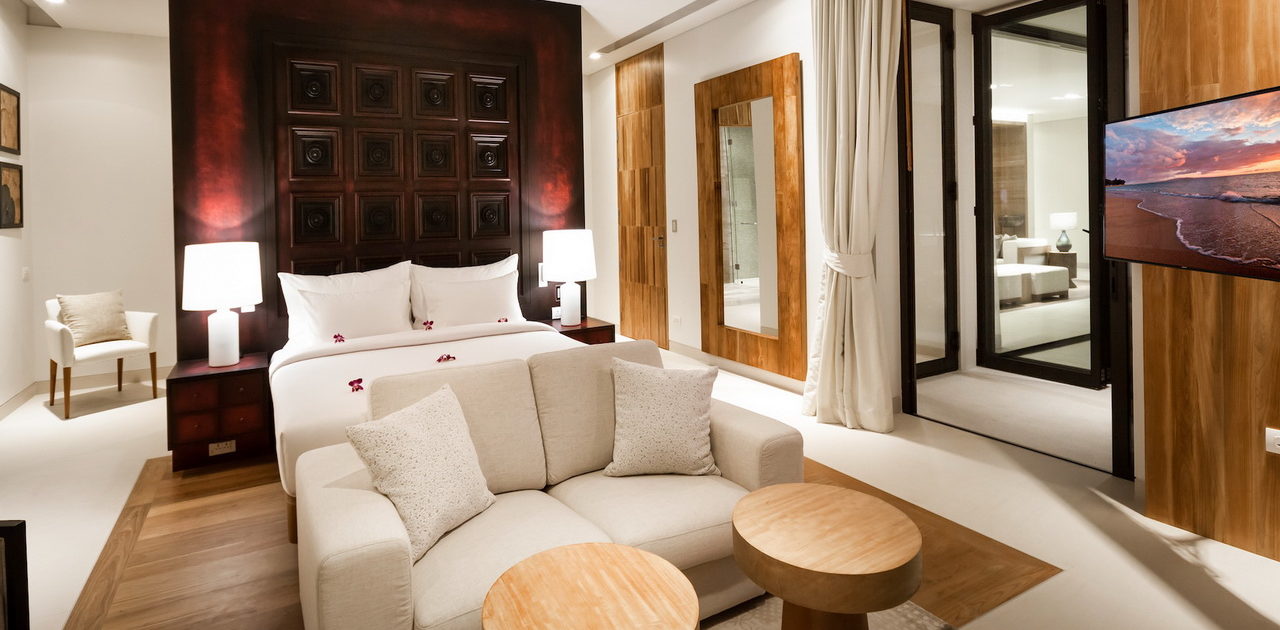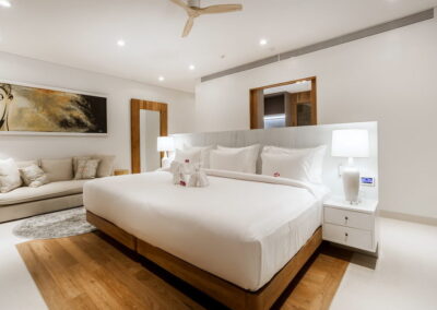 Guest Bedroom 2 (54 m2) — King Size Bed, Ocean and Pool view, 120 cm (50 inches) flat screen Samsung TV, Apple TV, His and her closet, Air-conditioning, Ceiling fan, Safety Deposit Box, 3 seater couch with two round tables, One chair, Ensuite Bathroom with round bath tub, Hansgrohe rain shower, double vanity, toilet, Toiletries, Marvel Shaving mirror, Hair dryer, Bathrobe, Slippers, Umbrella