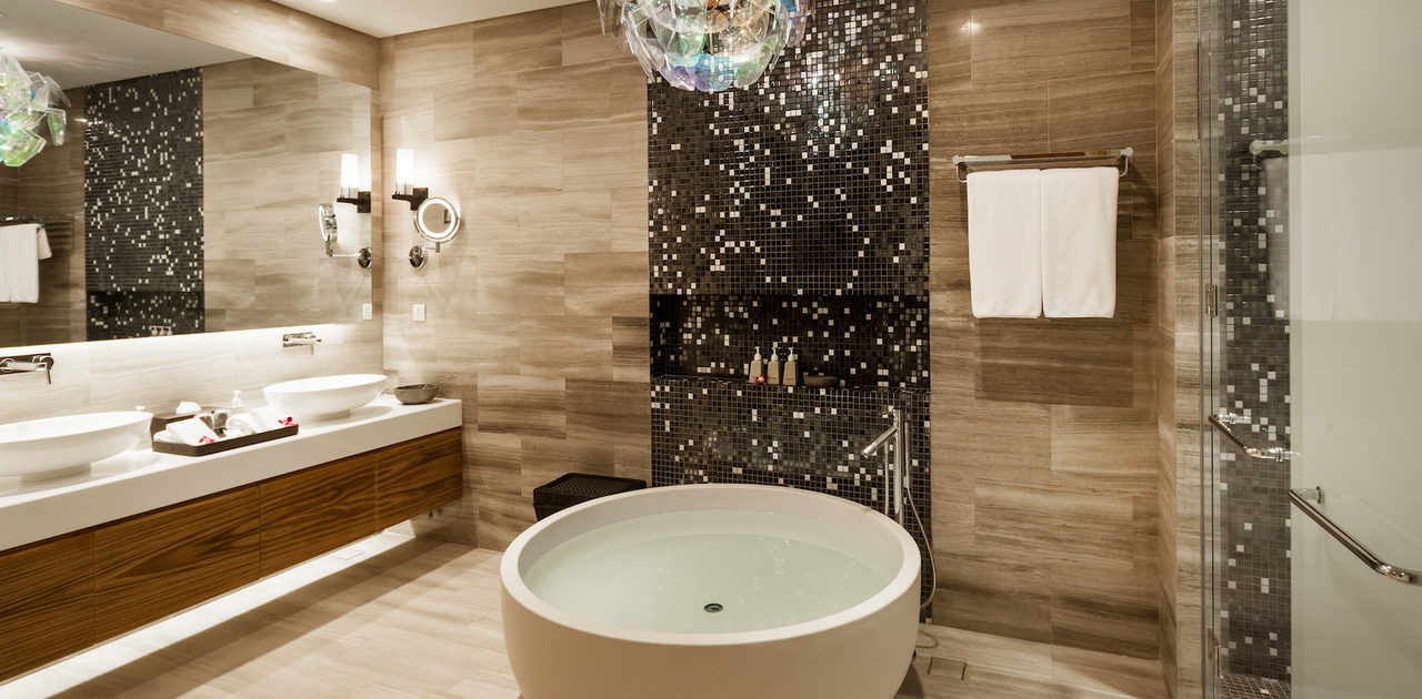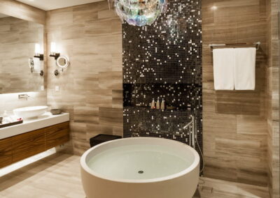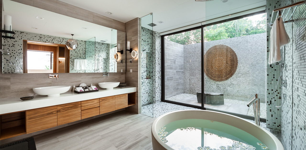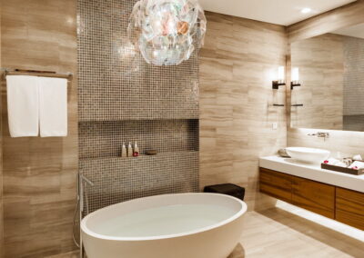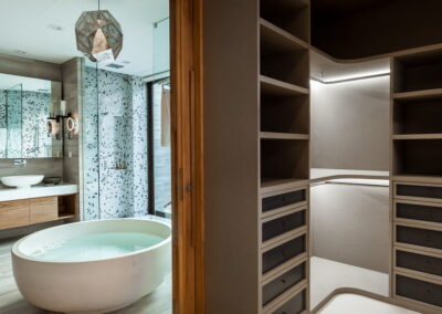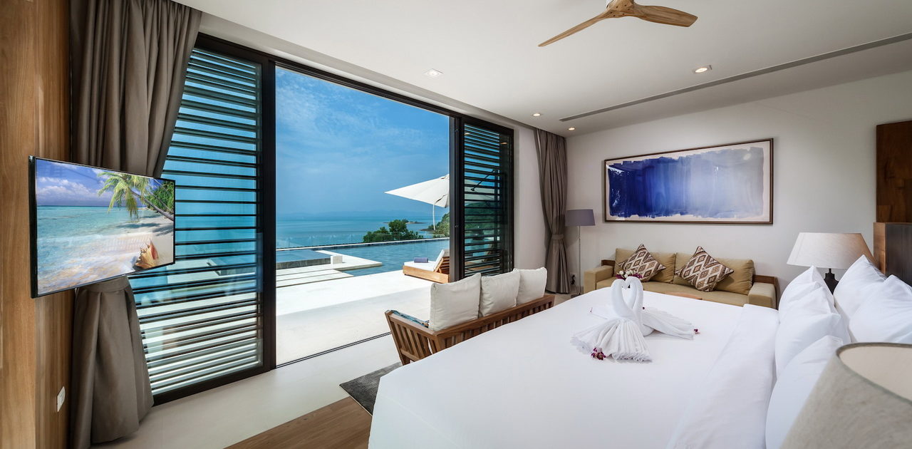 Master Bedroom 1 (80 m2) — Super King bed (W : 310 cm), Direct access to Jacuzzi for 6 people, Ocean View, 120 cm (50 inches) flat screen Samsung TV, Apple TV, His and her closet, Air-conditioning, Ceiling fan, Safety Deposit box, One day bed with two round tables, Sofa for two seating, Ensuite Bathroom with round bathtub, Double Hansgrohe rain shower, double vanity, toilet, Toiletries, Marvel shaving mirror, Hair dryer, Bathrobe, Slippers, Umbrella