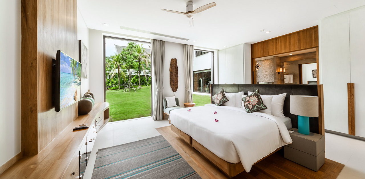Guest Bedroom 4 (54 m2) — King Size Bed or Twin Bed, Garden view, 120 cm (50 inches) flat screen Samsung TV, Apple TV, His and her closet, Air-conditioning, Ceiling fan, Safety Deposit Box, One chair, Ensuite Bathroom with oval bathtub, Hansgrohe rain shower, double vanity, separate toilet, Toiletries, Marvel shaving mirror, Hair dryer, Bathrobe, Slippers, Umbrella