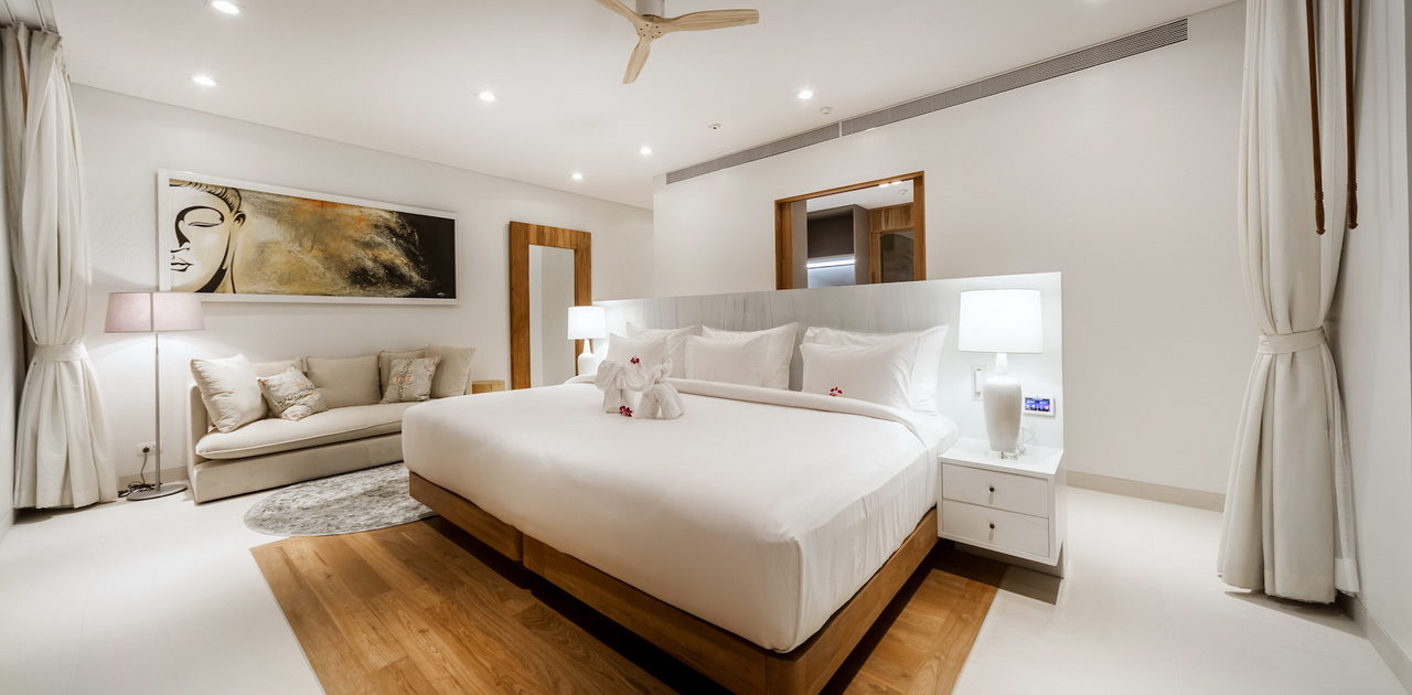 Master Bedroom 2 (90 m2) — Super King bed (W : 310 cm), Ocean, Pool and Garden View, 120 cm (50 inches) flat screen Samsung TV, Apple TV, Walk in closet with one stool, Air-conditioning, Ceiling fan, Safety Deposit Box, One day bed, Ensuite Bathroom with round bath tub, Double Hansgrohe rain shower, double vanity, toilet, Toiletries, Marvel shaving mirror, Hair dryer, Bathrobe, Slippers, Umbrella