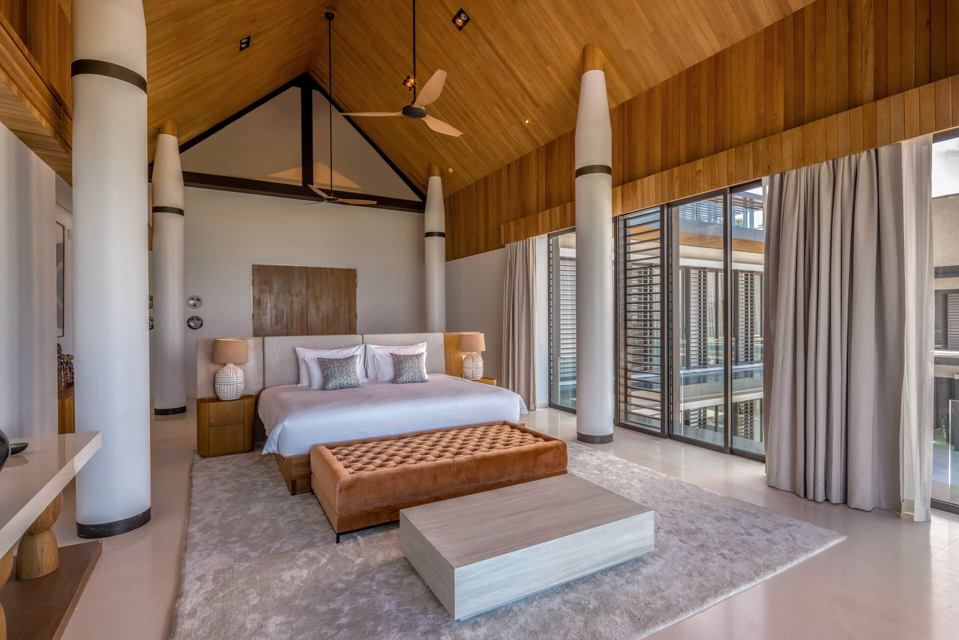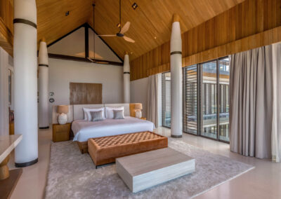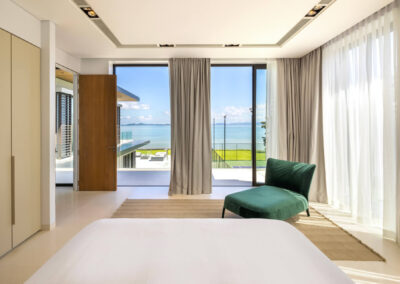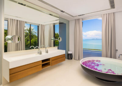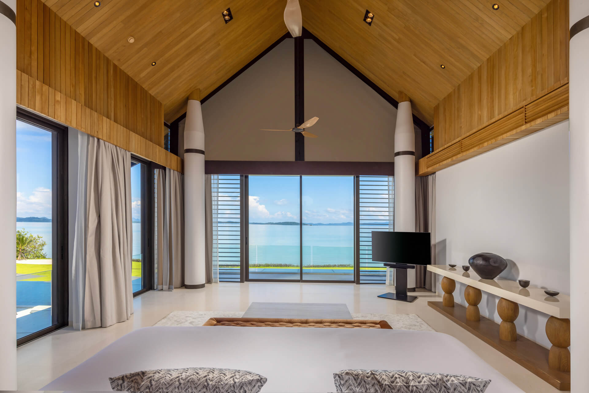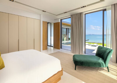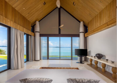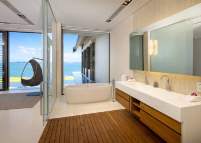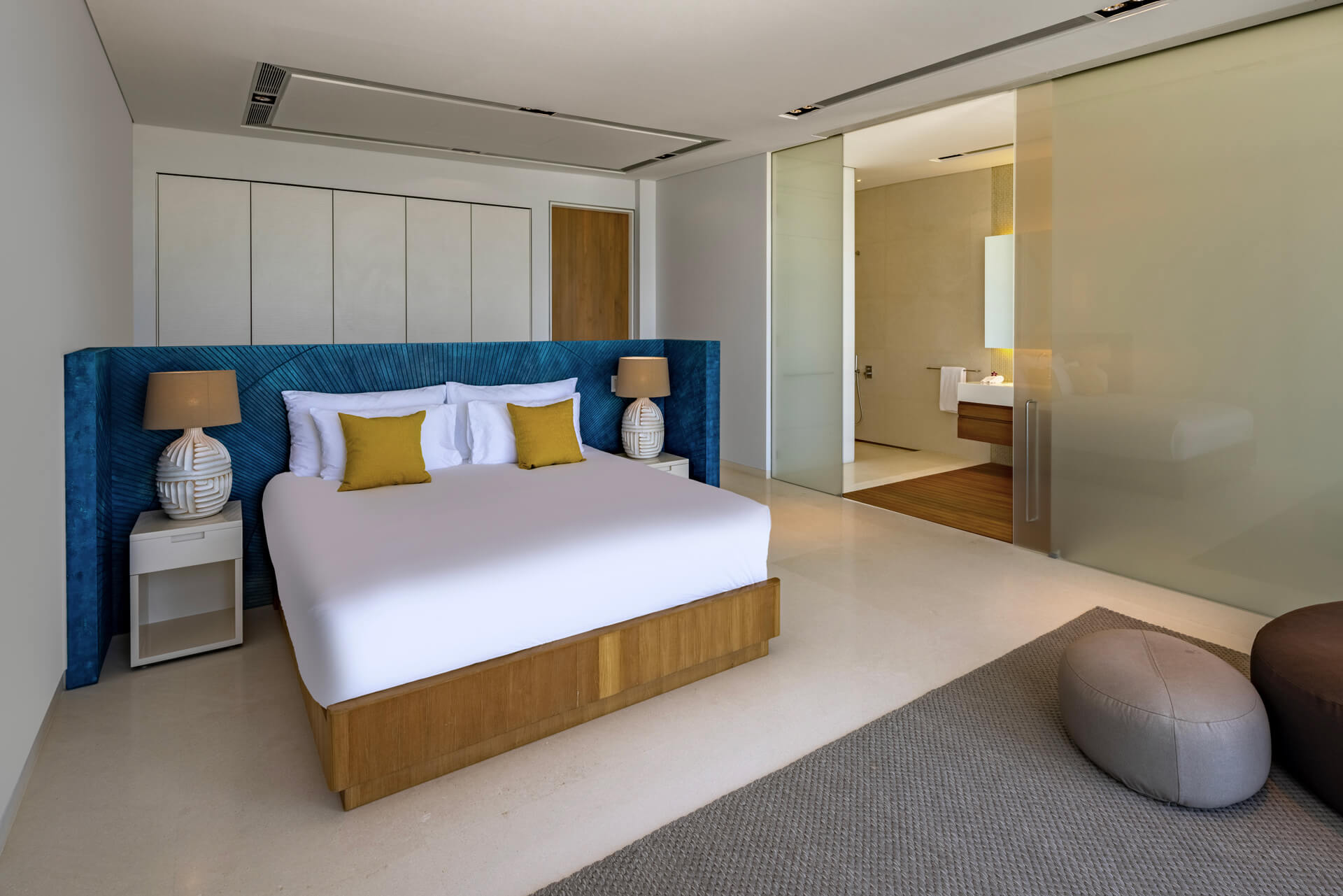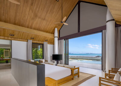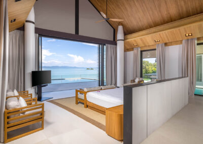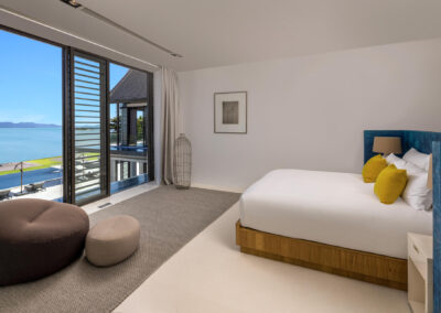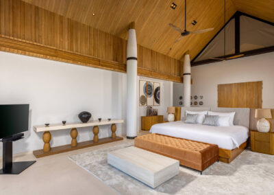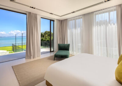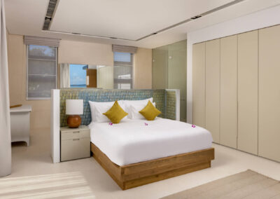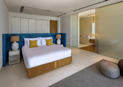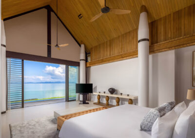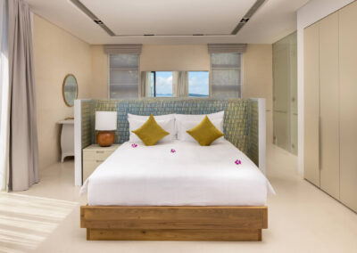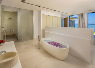 Guest Bedroom 3 (Upper Level, 62 sqm) — King-size bed; Sea and beach view; Working desk; Large closet; Air conditioning; Ensuite bathroom with bathtub & shower, rain shower, large vanity for two, and separate toilet; Toiletries, Hairdryer; Bathrobes; Slippers; Umbrellas