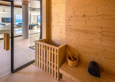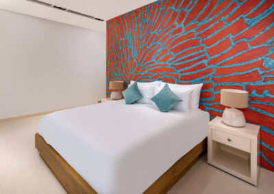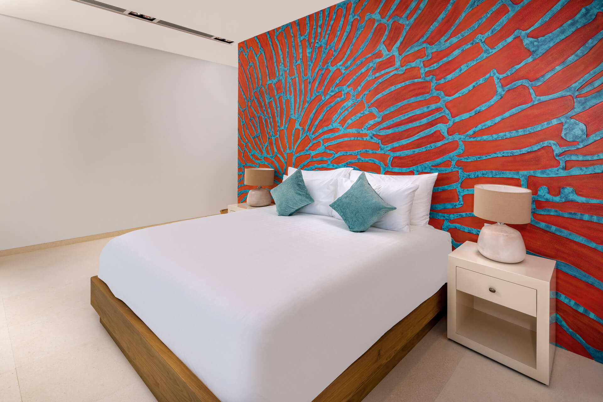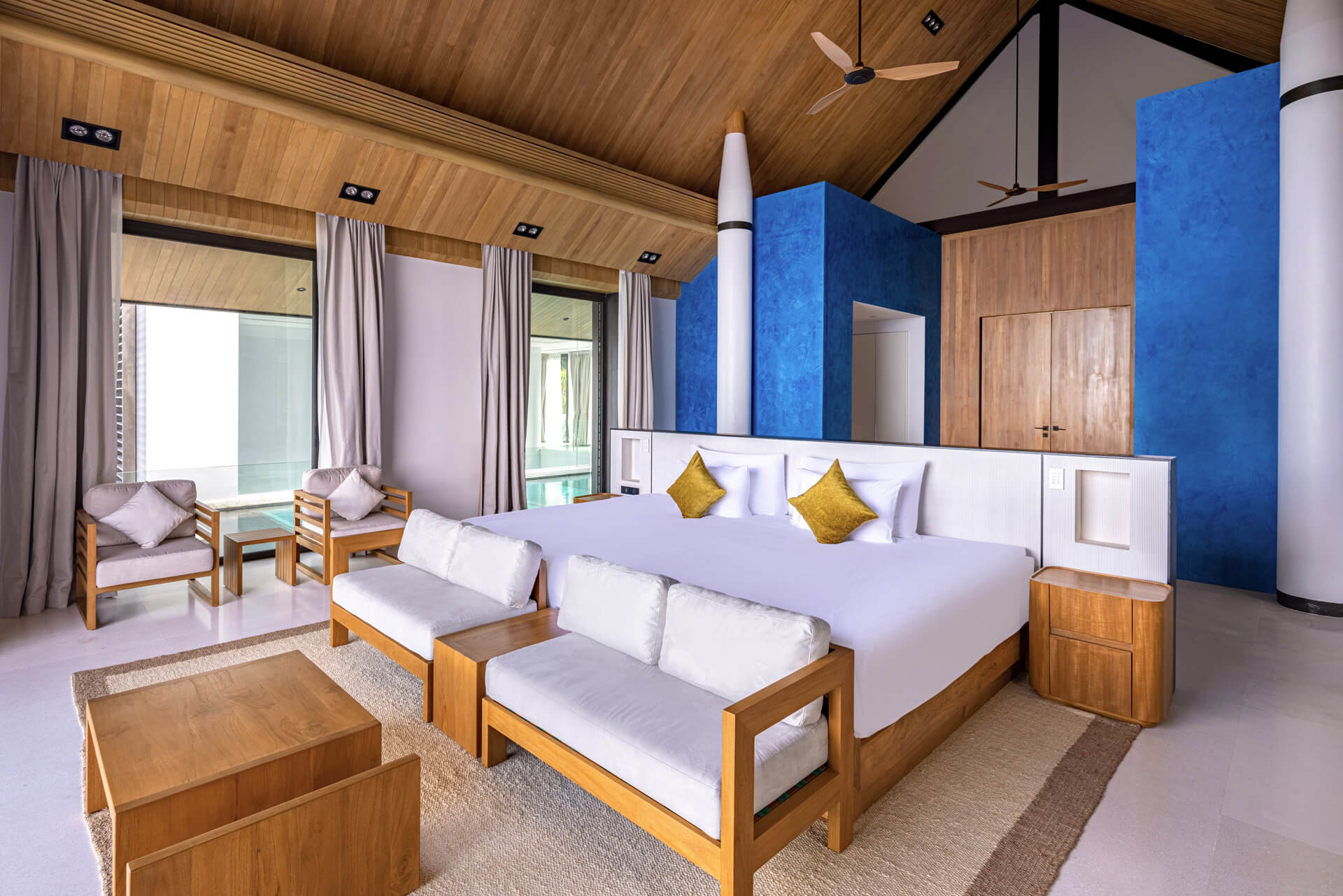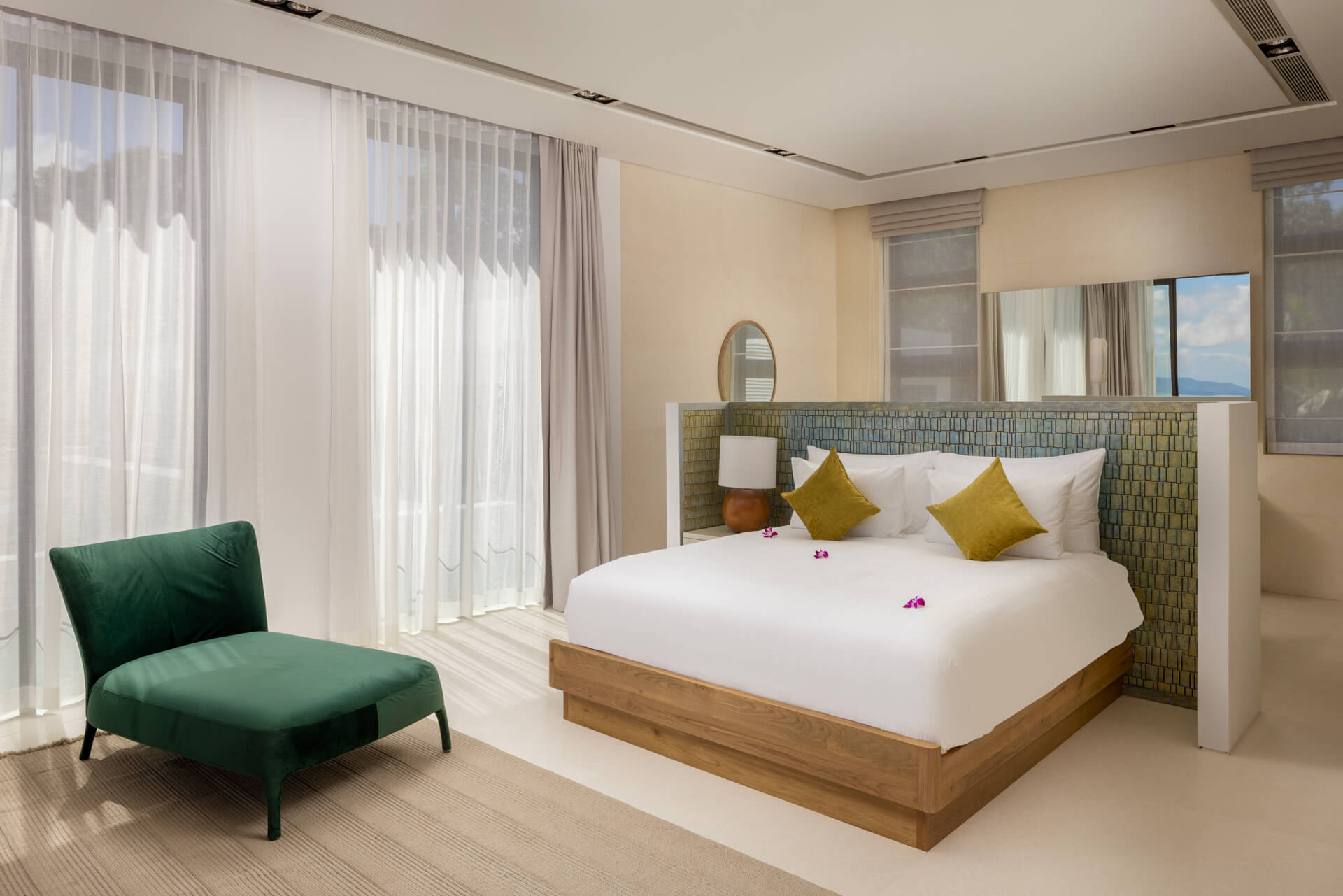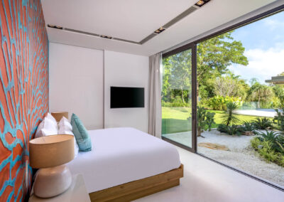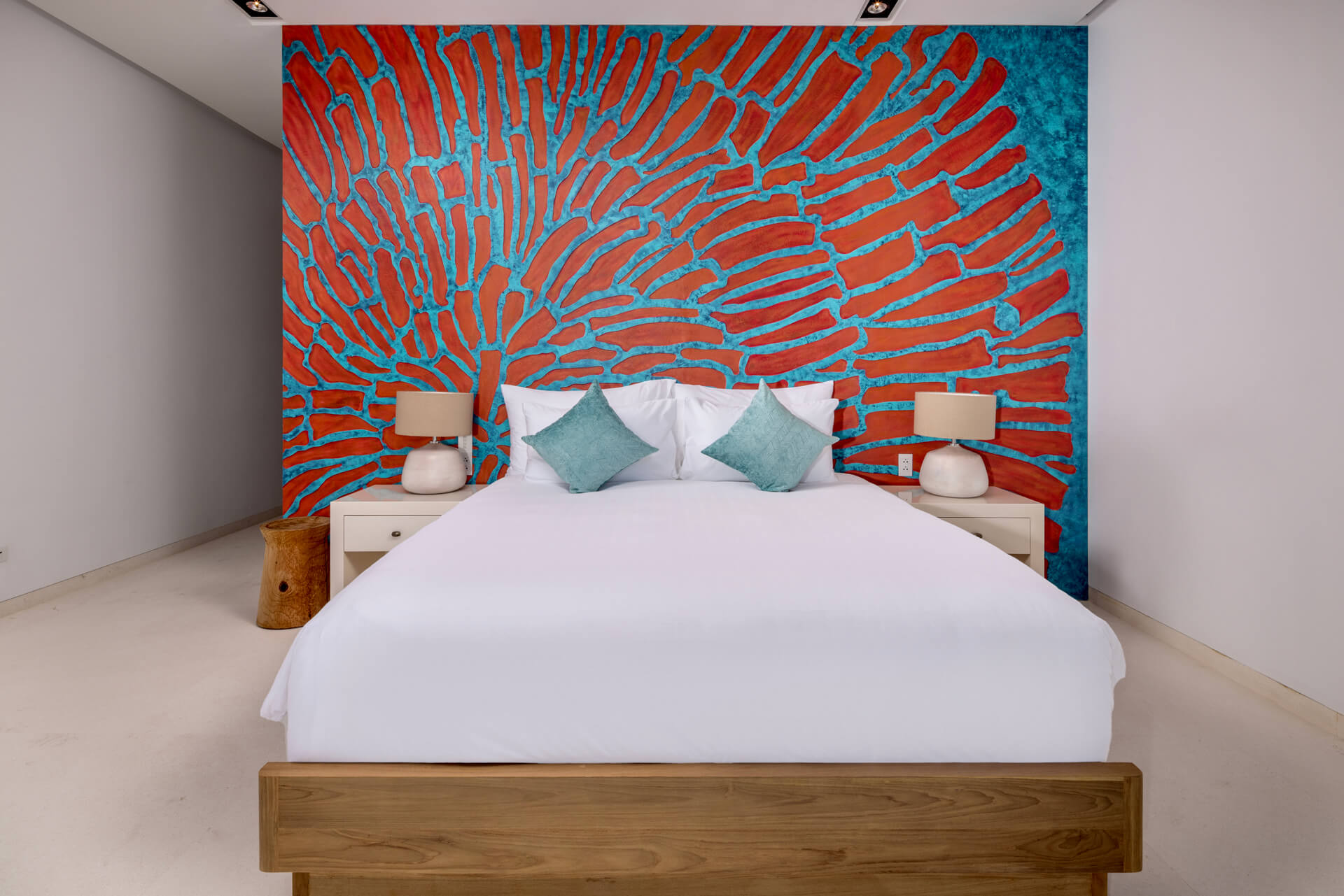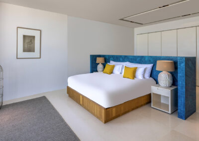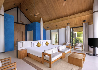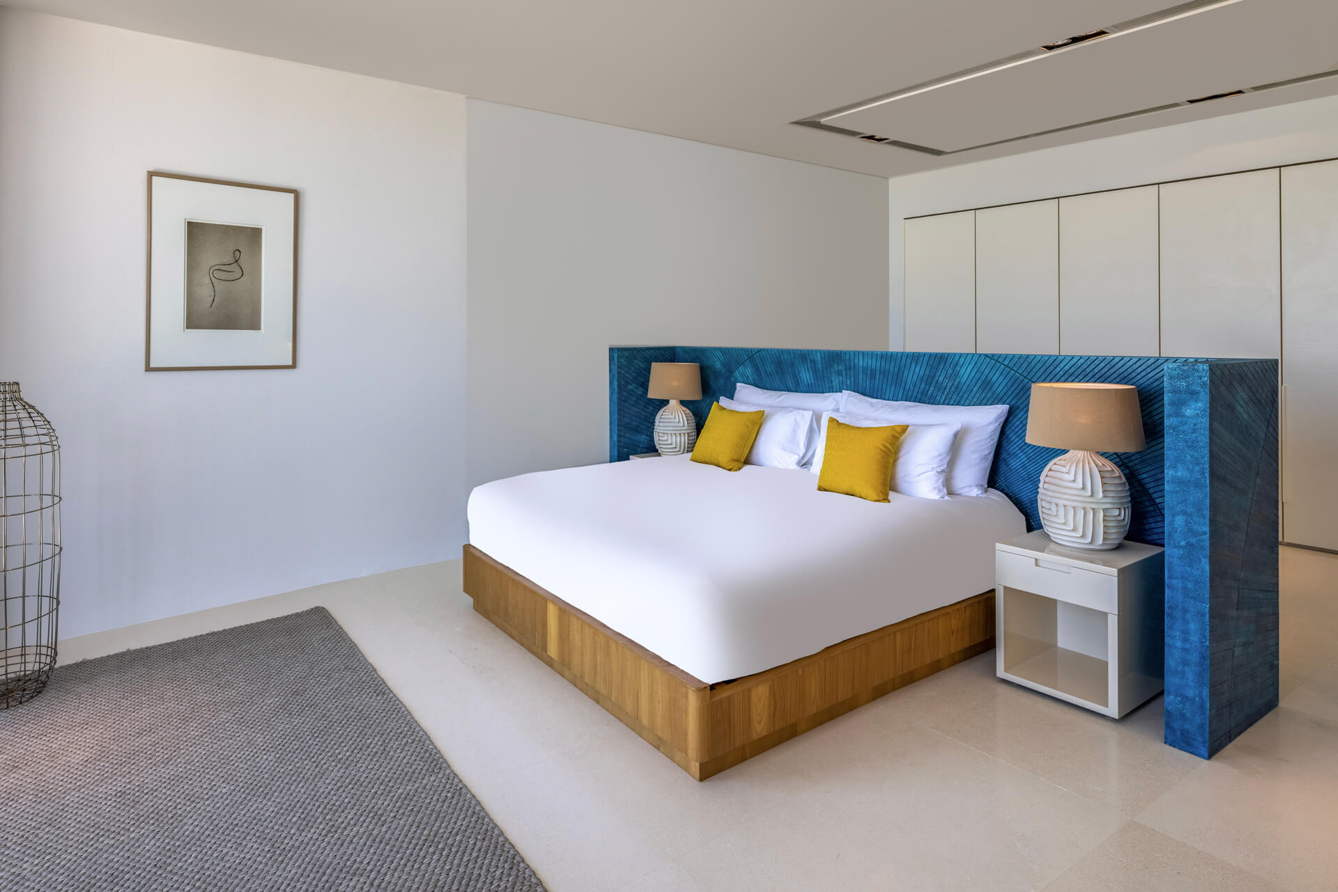Guest Bedroom 3 (Upper Level, 62 sqm) — King-size bed; Sea and beach view; Working desk; Large closet; Air conditioning; Ensuite bathroom with bathtub & shower, rain shower, large vanity for two, and separate toilet; Toiletries, Hairdryer; Bathrobes; Slippers; Umbrellas