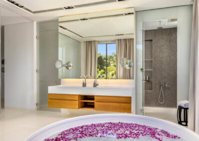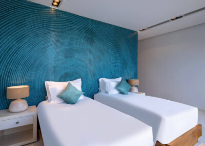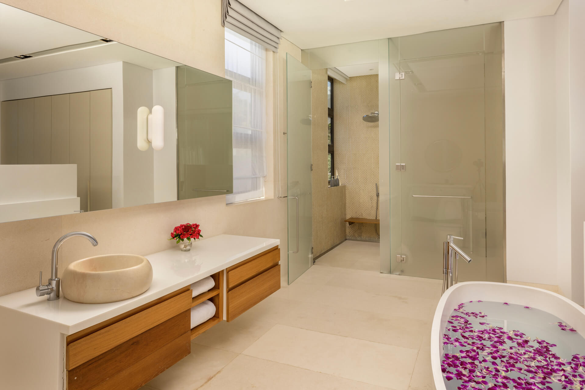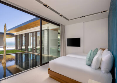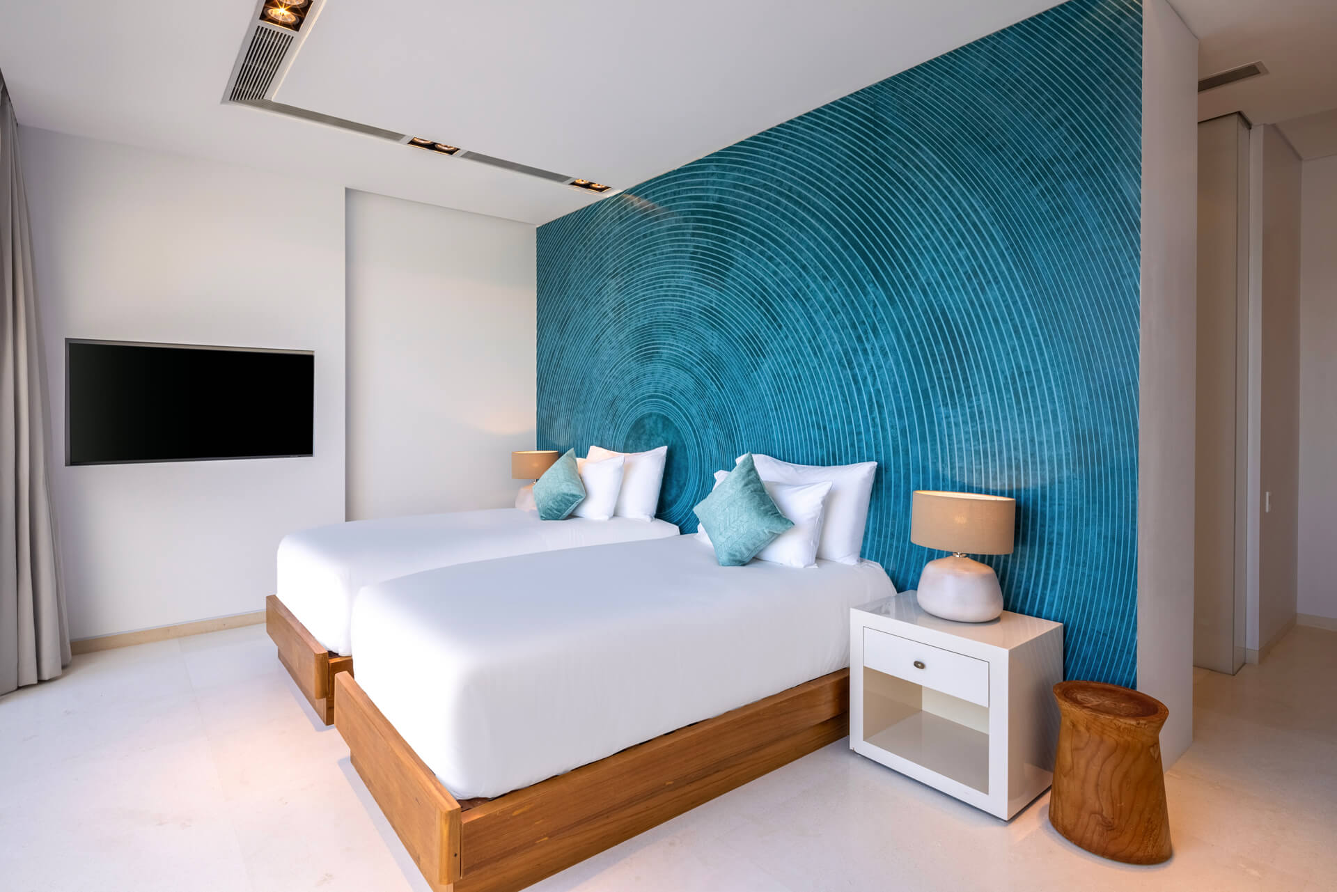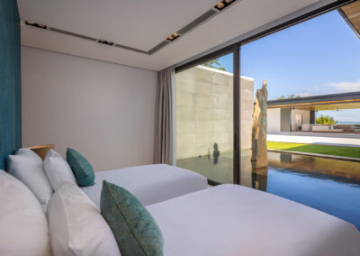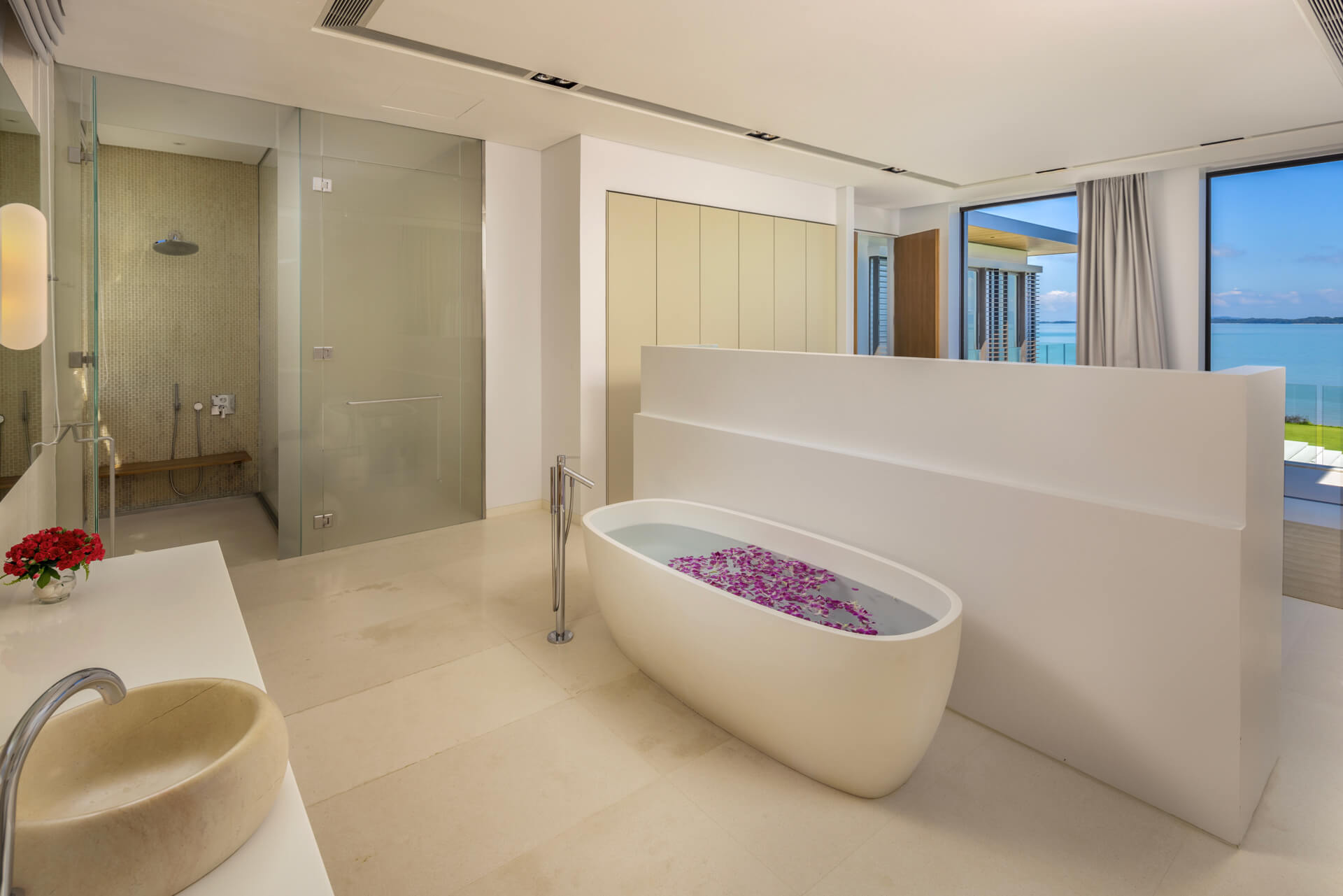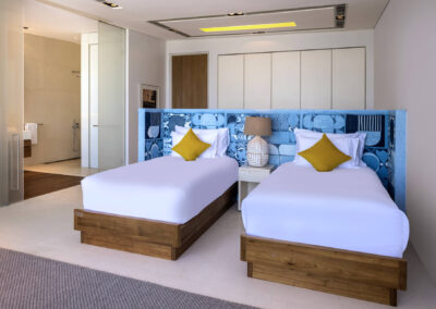 Guest Bedroom 4 (Upper Level, 34.45 sqm) — Two single beds or 1 king-size bed; Sea and beach view; Working desk; Large closet; Safety box; Air conditioning; Ensuite bathroom with bathtub & shower, rain shower, large vanity for 2, and separate toilet; Toiletries; Hairdryer; Bathrobes; Slippers; Umbrellas