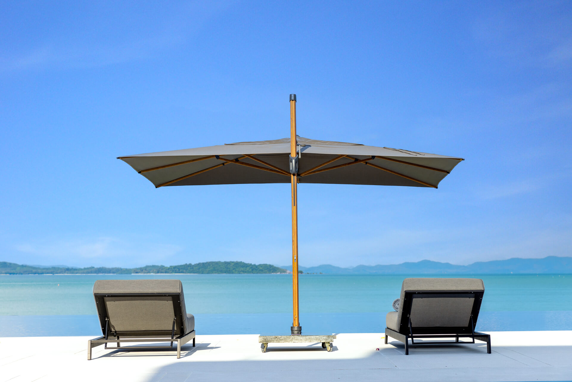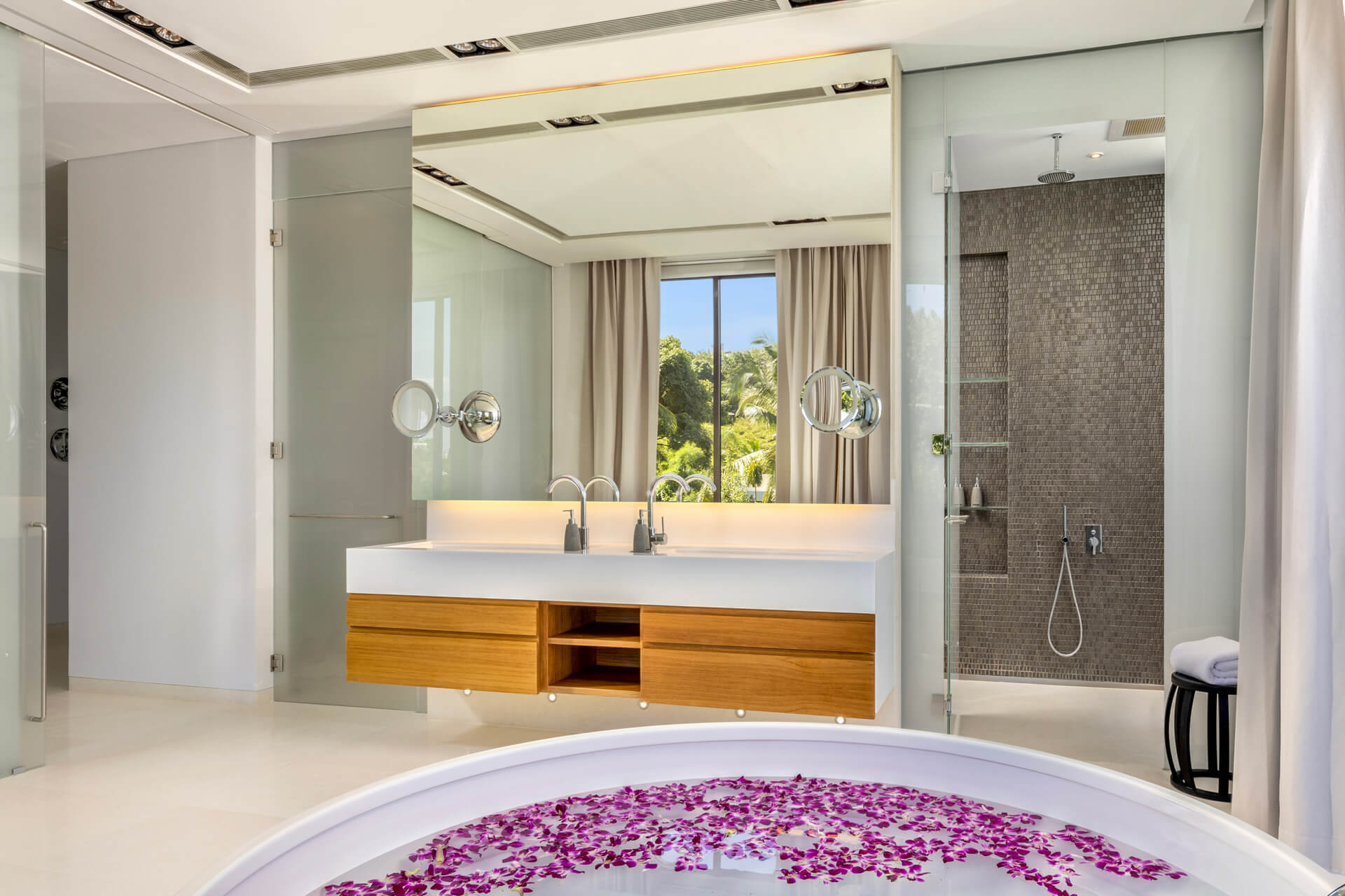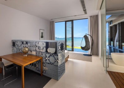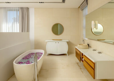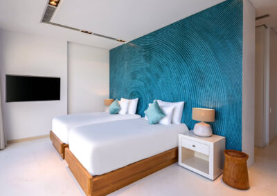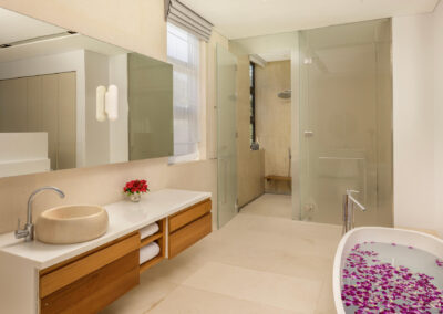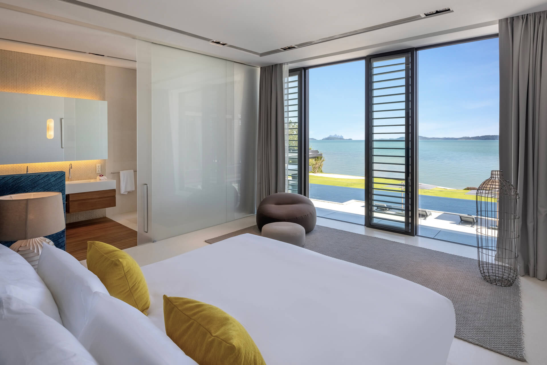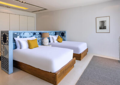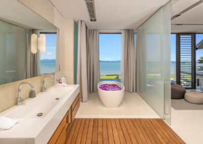 Guest Bedroom 4 (Upper Level, 34.45 sqm) — Two single beds or 1 king-size bed; Sea and beach view; Working desk; Large closet; Safety box; Air conditioning; Ensuite bathroom with bathtub & shower, rain shower, large vanity for 2, and separate toilet; Toiletries; Hairdryer; Bathrobes; Slippers; Umbrellas