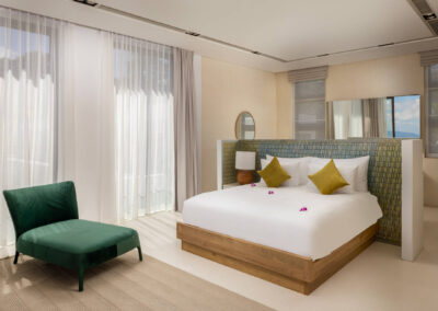 Guest Bedroom 5 (Upper Level, 34.45 sqm) — King-size bed; Sea and beach view; Large closet; Safety box; Terrace; Air conditioning; Ensuite bathroom with bathtub & shower, rain shower, vanity, and separate toilet; Toiletries; Hairdryer; Bathrobes; Slippers; Umbrella