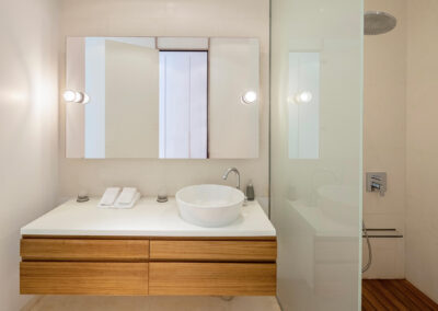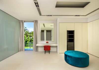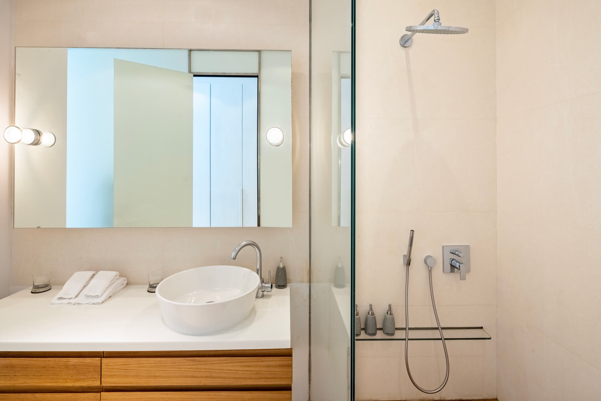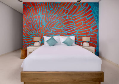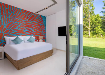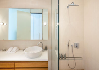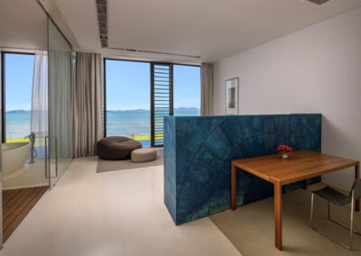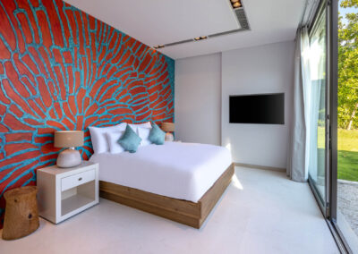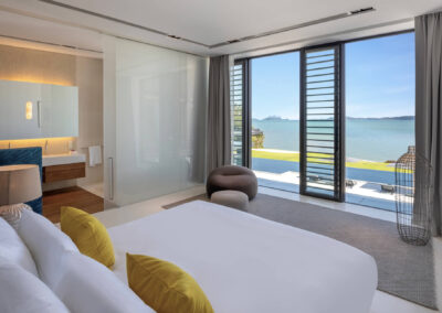 Guest Bedroom 2 (Lower Level, 62 sqm) — 2 single beds or 1 king-size bed; Sea and art view; Walk-in closet; Safety box; Air conditioning; 50-inch SMART flatscreen TV; Ensuite with rain shwoer & shower, vanity, and toilet; Toiletries; Hairdryer; Bathrobes; Slippers; Umbrellas