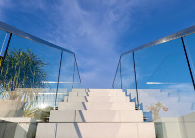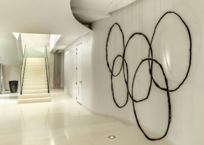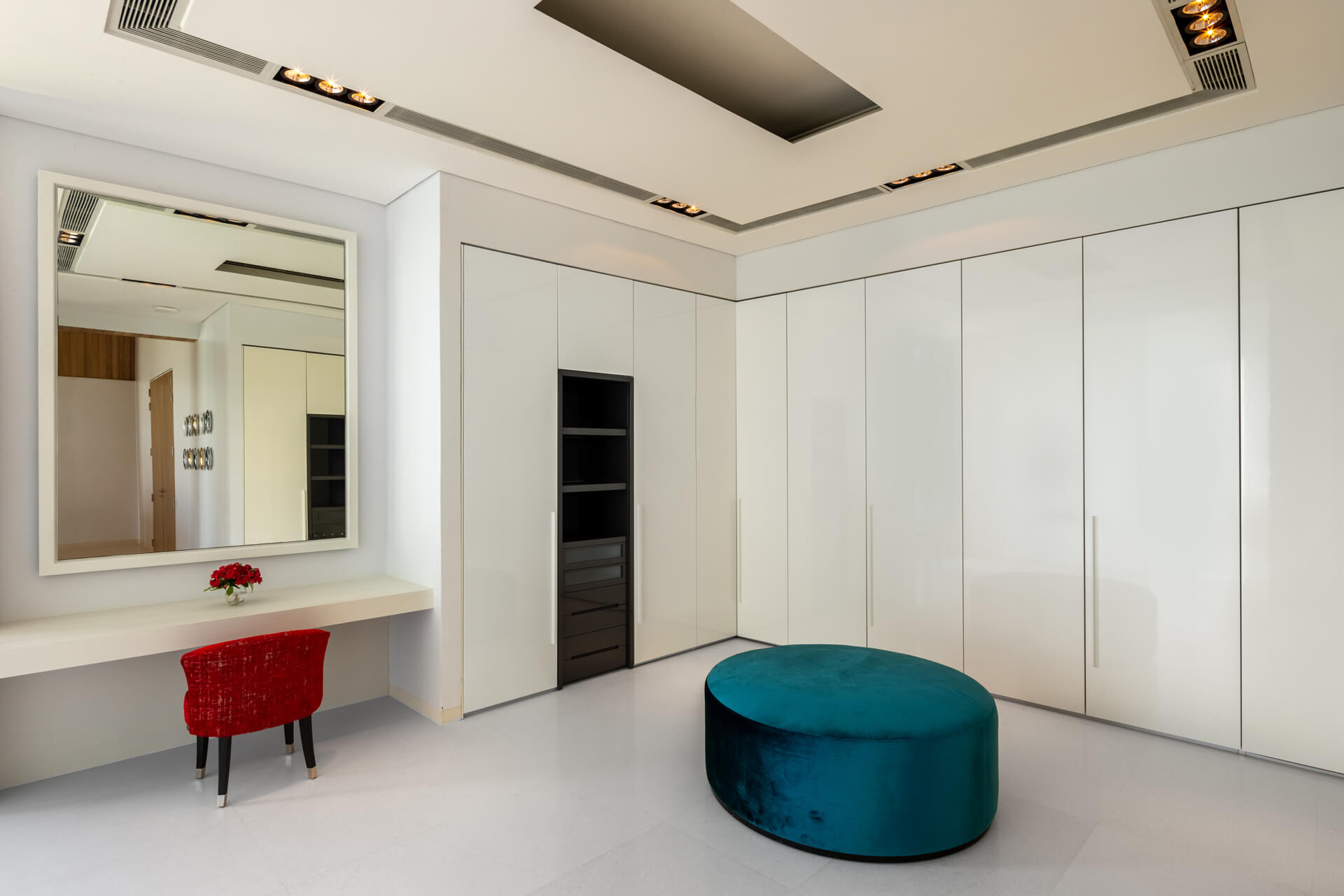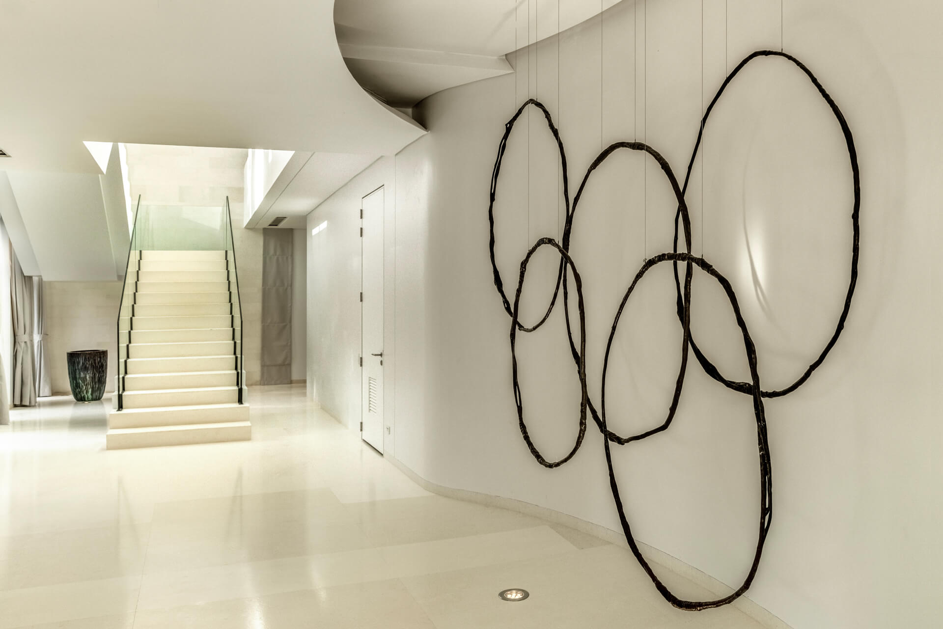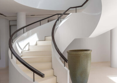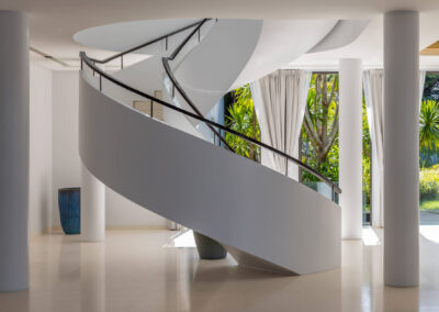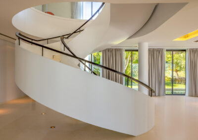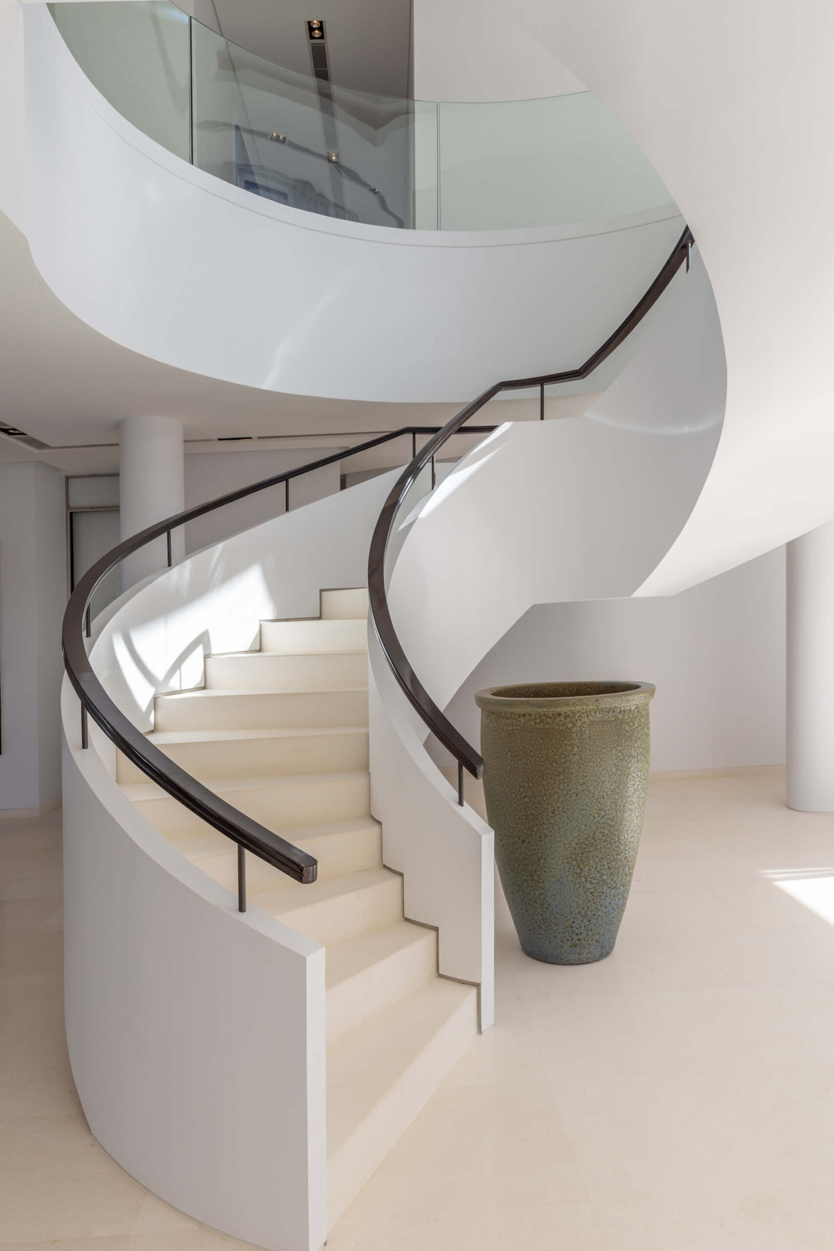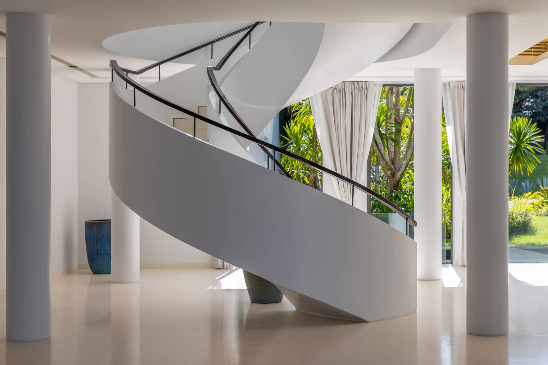 Lounge in an elegant open-space living and dining area or go up straightaway to the upper levels to explore, taking the glass-lined staircase by the main entrance or the striking spiral stairway reminiscent of a seashell’s whorl at the other end, both of which complete the atmosphere with a modern feel.
