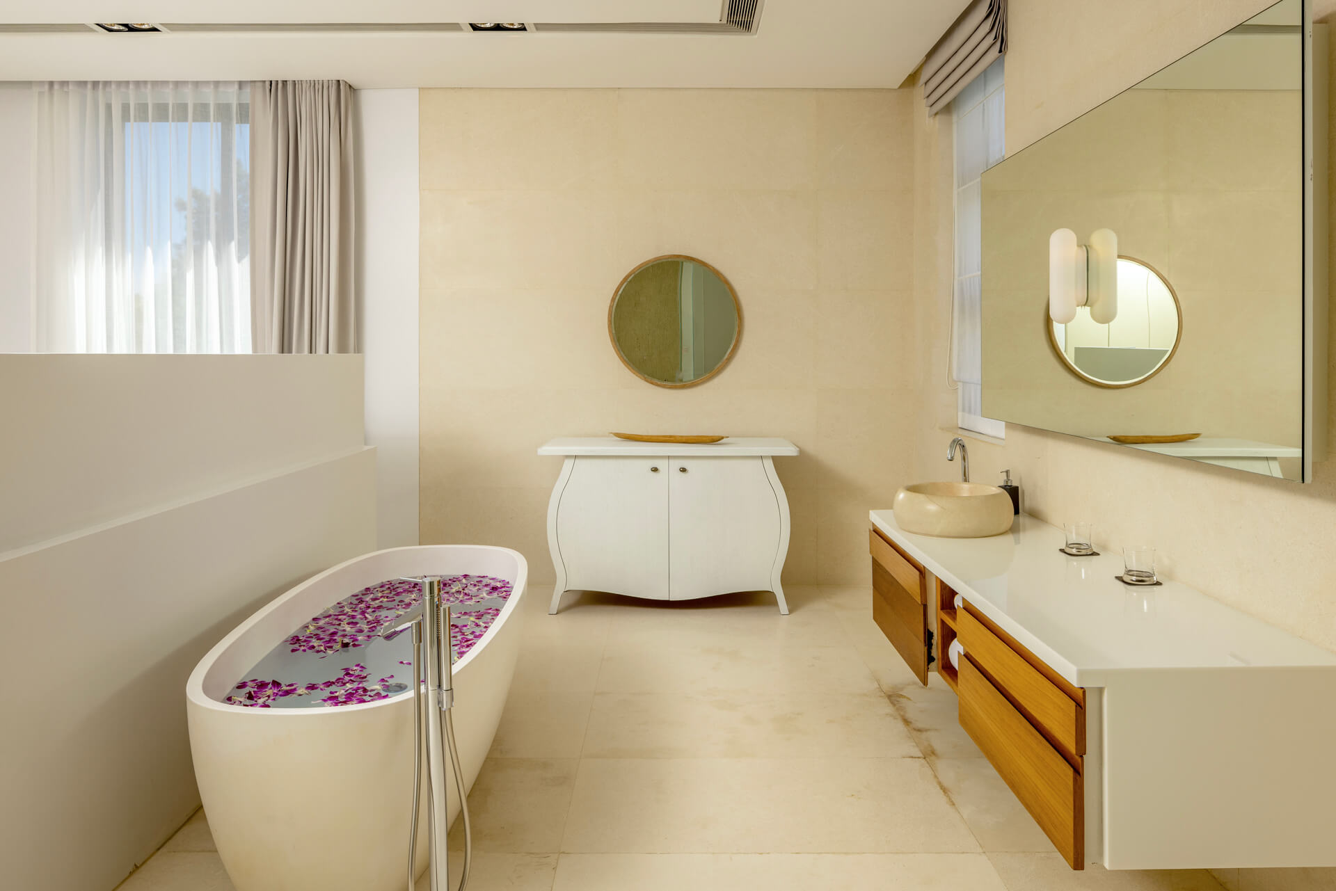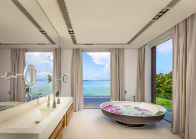 Master Bedroom 2 (Upper Level, 168 sqm) — Super king-size bed; Sea and beach view; Seating area for 3 persons; 50-inch SMART flatscreen TV; SONOS sound system; Large walk-in closet; Safety box; Makeup table; Ceiling fan; Air conditioning; Ensuite bathroom with round bathtub, double rain shower & shower, double vanities, and separate toilet; Large terrace; Toiletries; Hair dryer; Bathrobes; Slippers; Umbrellas