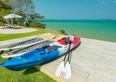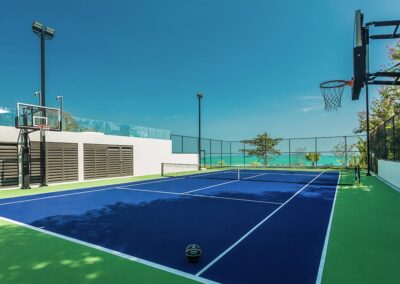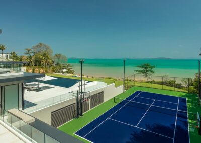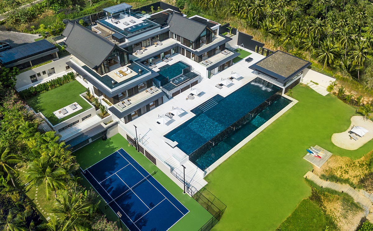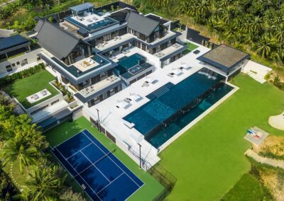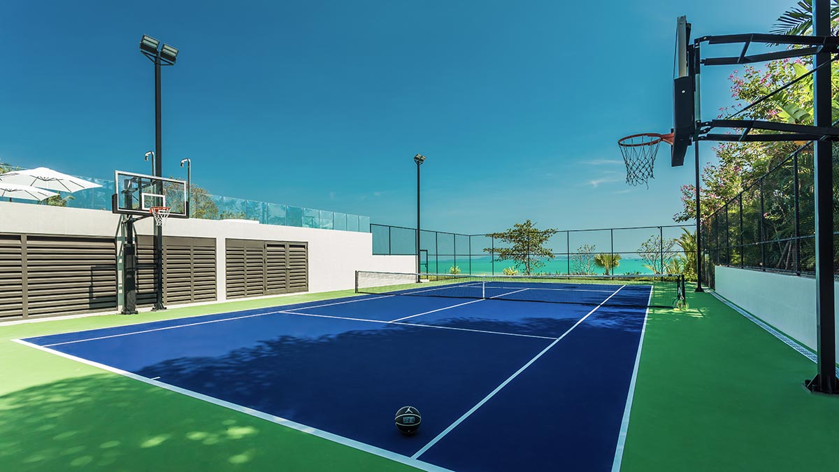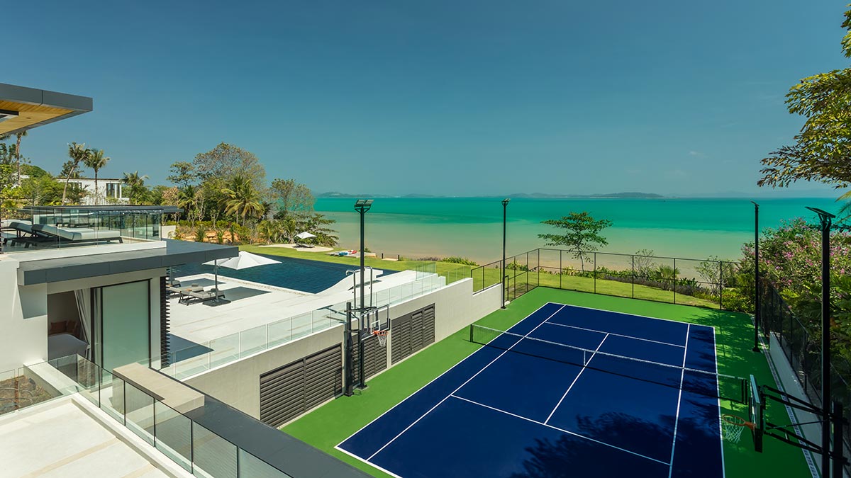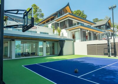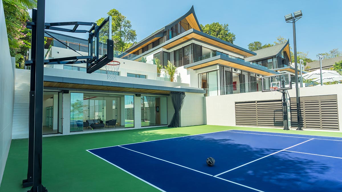 The 8,000-square meter property indulges every guest. Settle in an entertainment area, home cinema, spa room, or a game room with a golf simulator and wine cellar. Embrace high-energy activities with a well-equipped gym, basketball, tennis, and squash courts, a kiddie playground, kayaks, and paddleboards.
