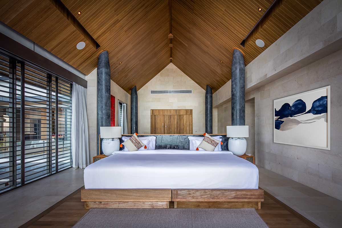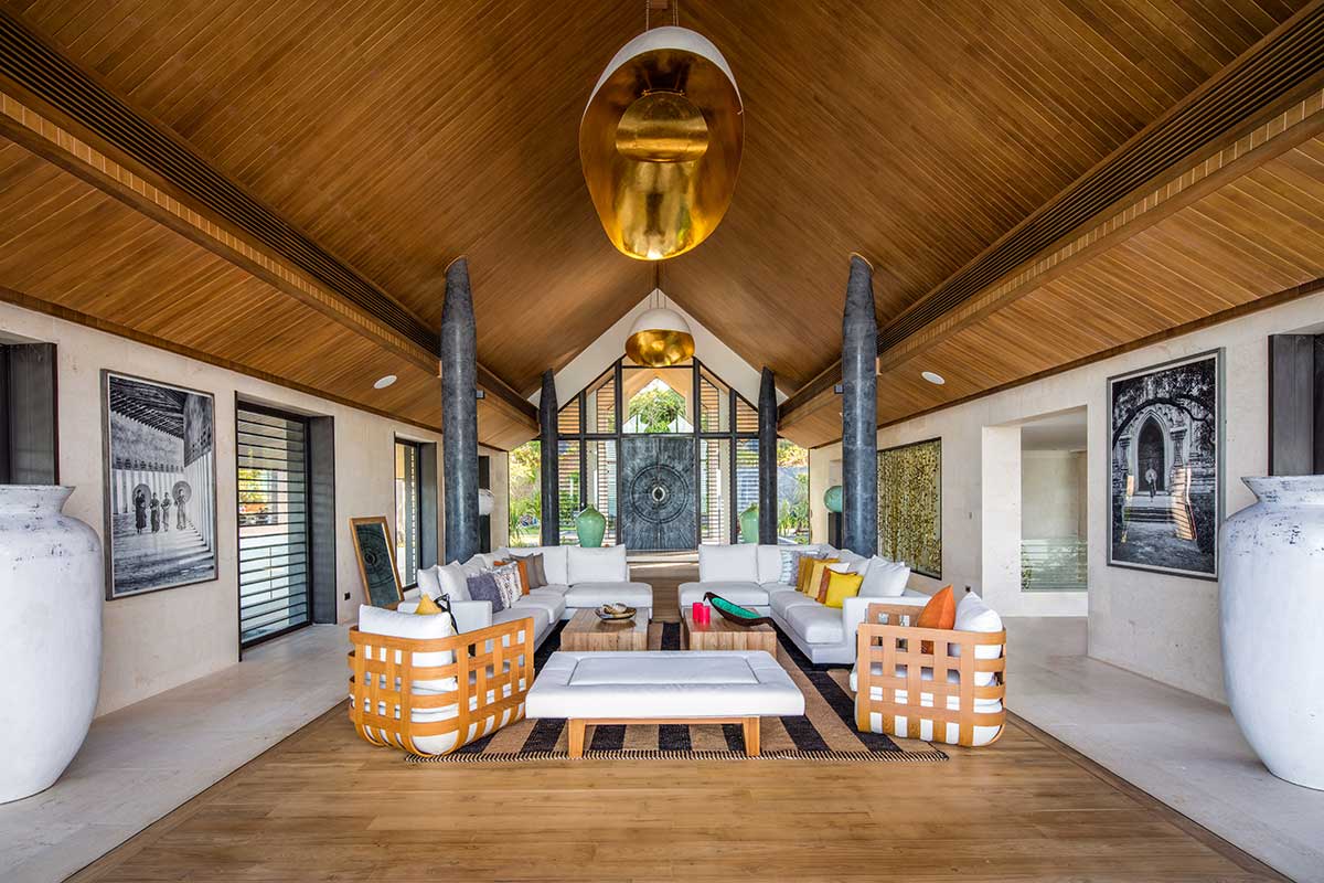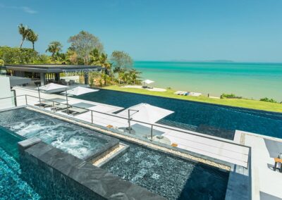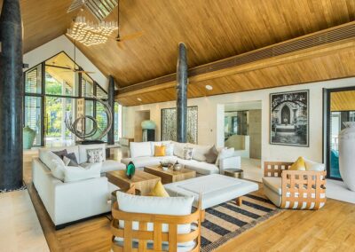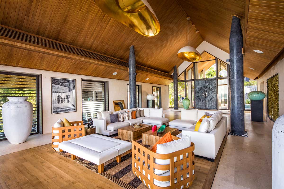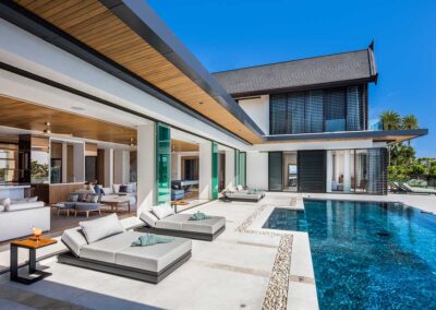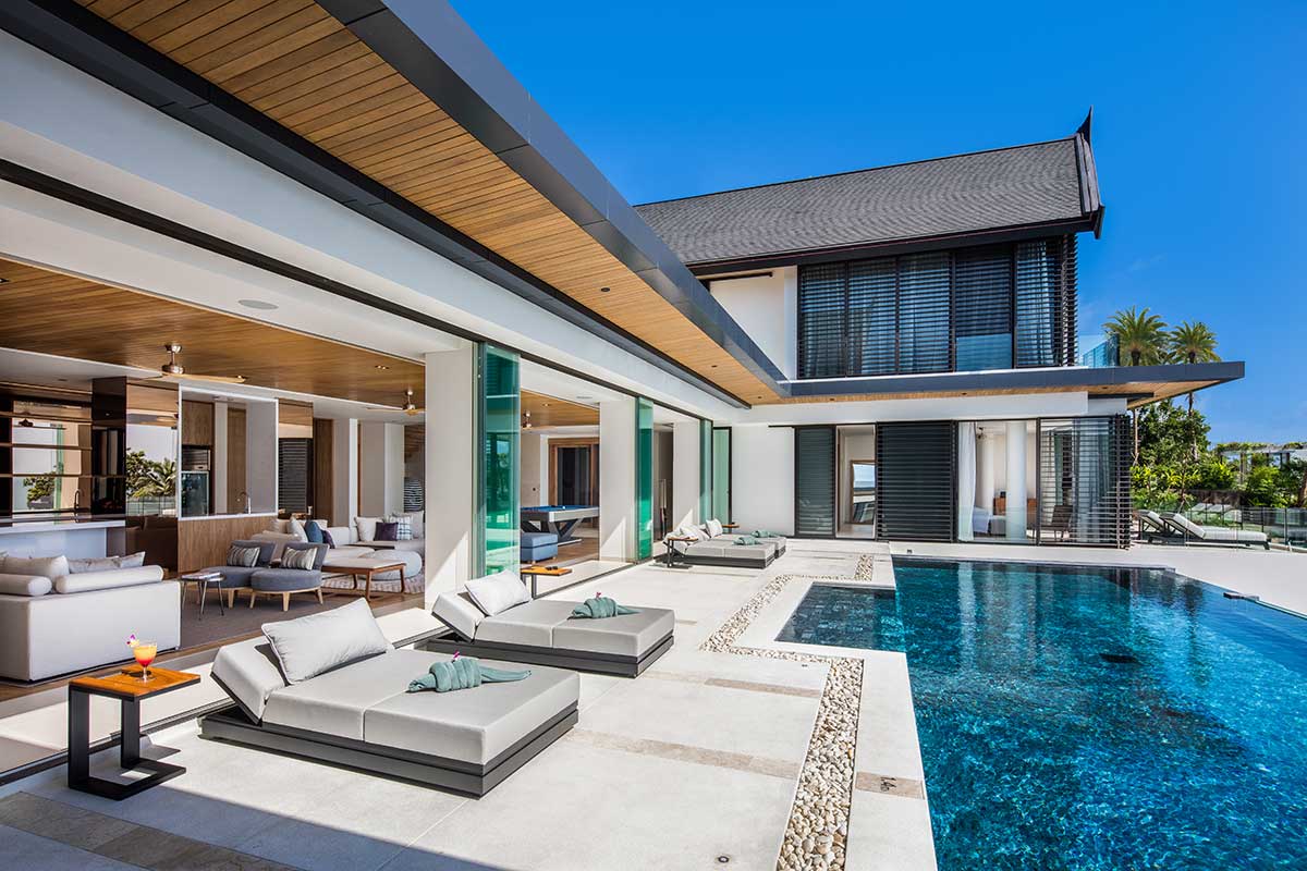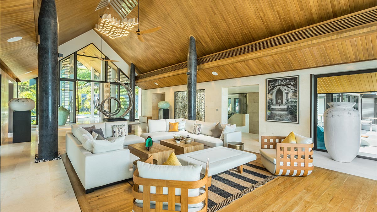 Perhaps truly rounding out the villa are its water features made for the ultimate tropical holiday. Dip into a large jacuzzi on a roof bar, or another one on the mid-level, linked to an 11-meter lap pool. For a grander feel, conquer a massive, ground-level swimming pool, at least 38 meters in length, with access to the beach and its own pool sala for outdoor dining and lounging fun.