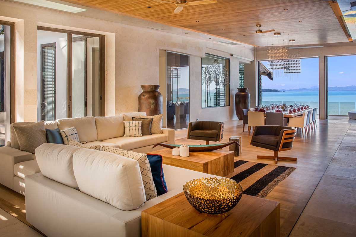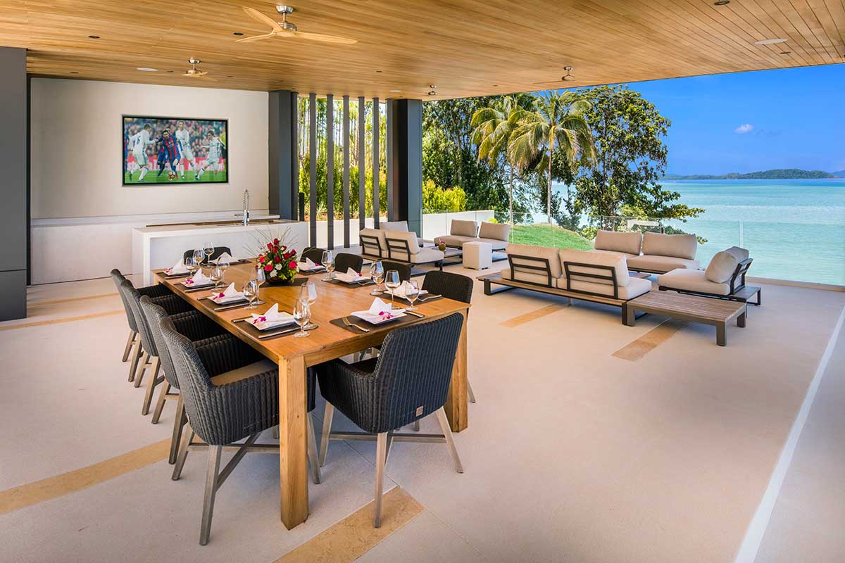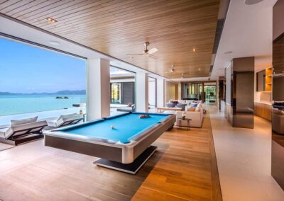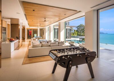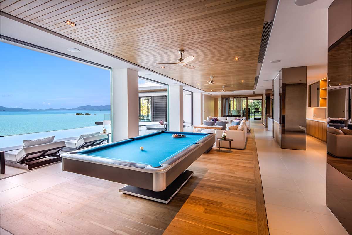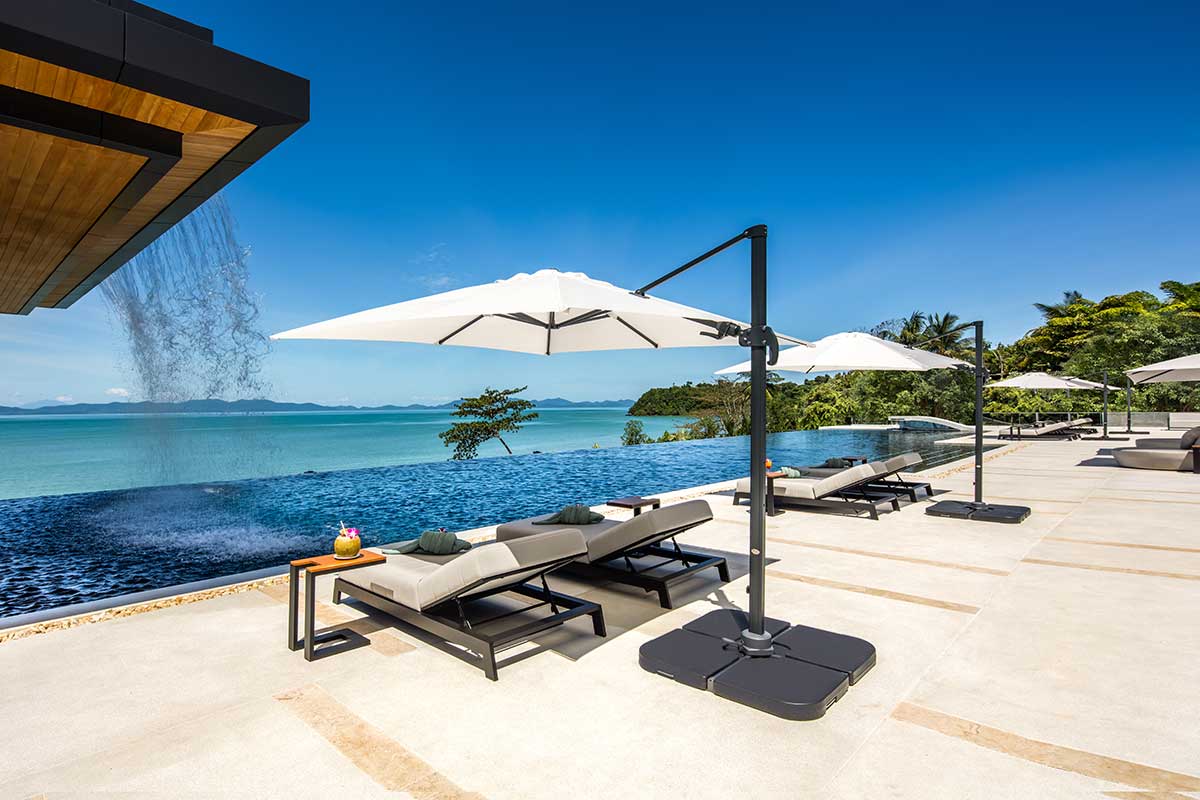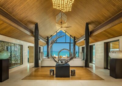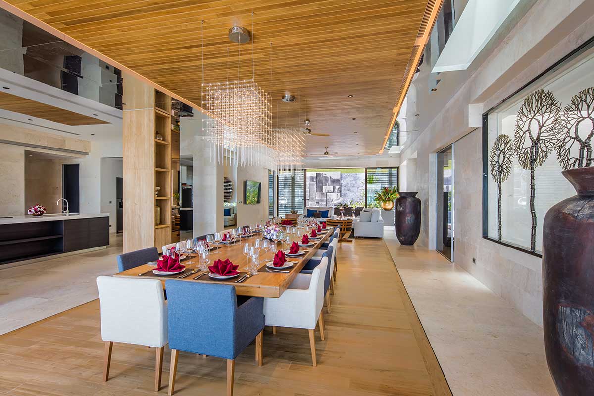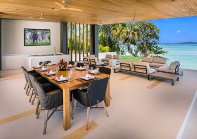Perhaps truly rounding out the villa are its water features made for the ultimate tropical holiday. Dip into a large jacuzzi on a roof bar, or another one on the mid-level, linked to an 11-meter lap pool. For a grander feel, conquer a massive, ground-level swimming pool, at least 38 meters in length, with access to the beach and its own pool sala for outdoor dining and lounging fun.