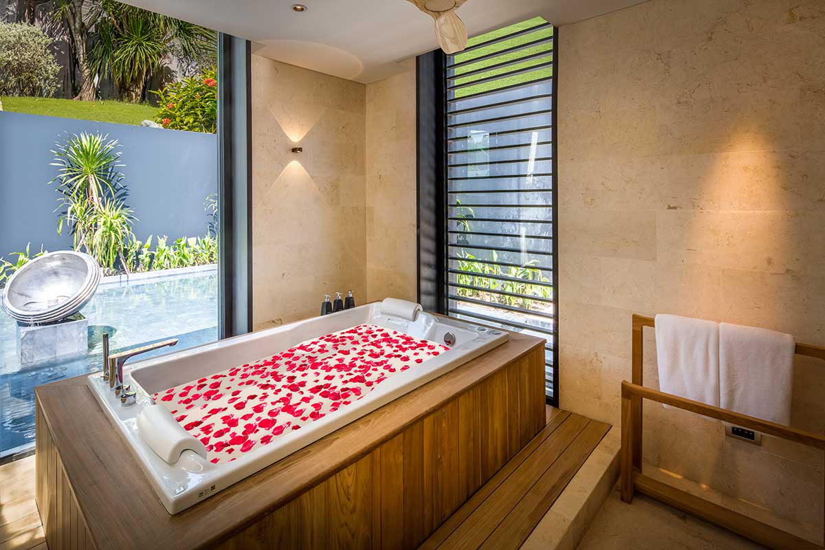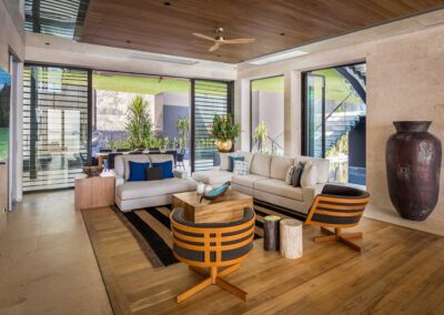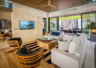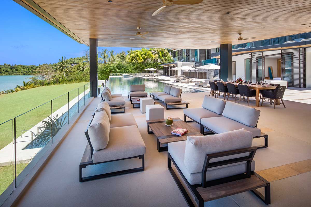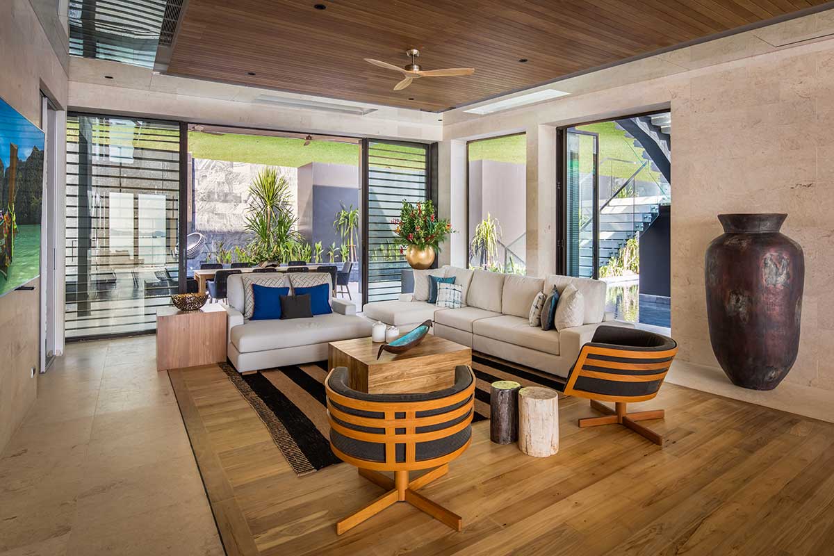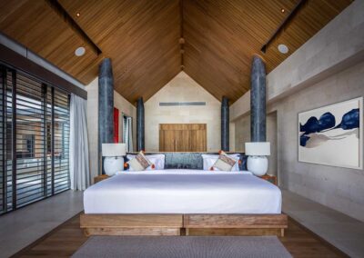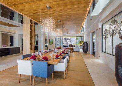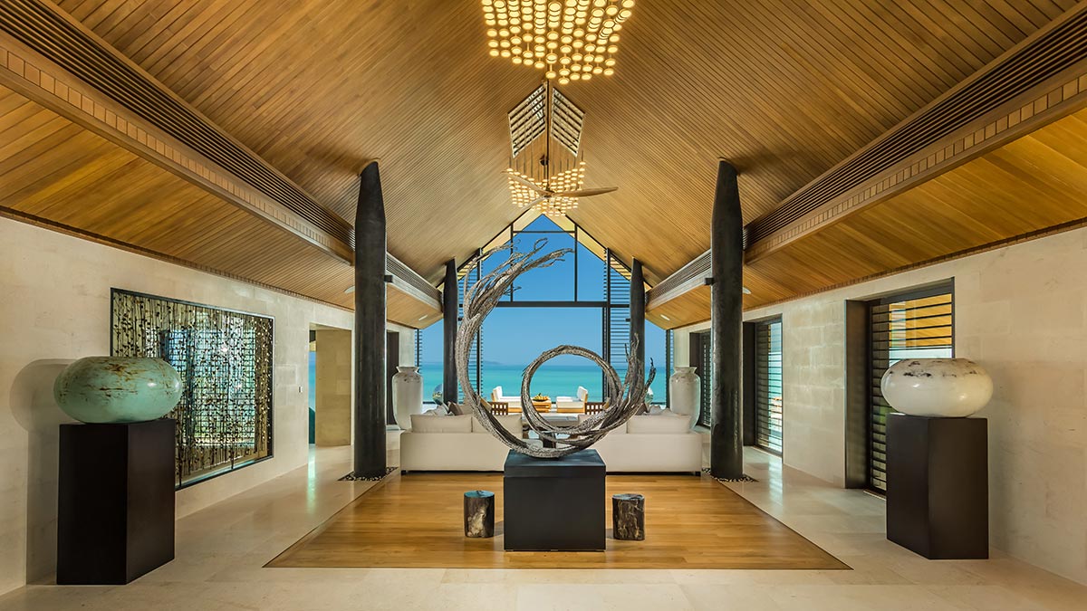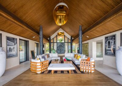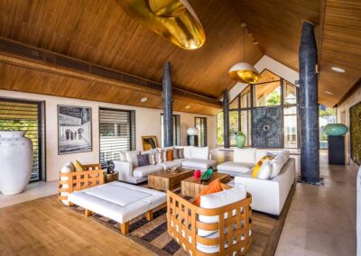 Perhaps truly rounding out the villa are its water features made for the ultimate tropical holiday. Dip into a large jacuzzi on a roof bar, or another one on the mid-level, linked to an 11-meter lap pool. For a grander feel, conquer a massive, ground-level swimming pool, at least 38 meters in length, with access to the beach and its own pool sala for outdoor dining and lounging fun.