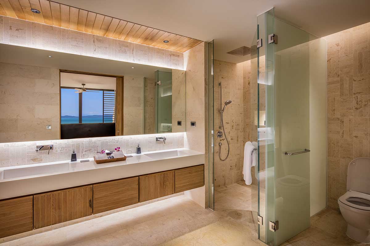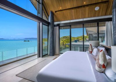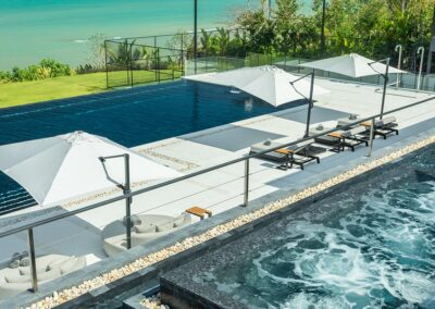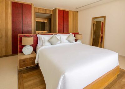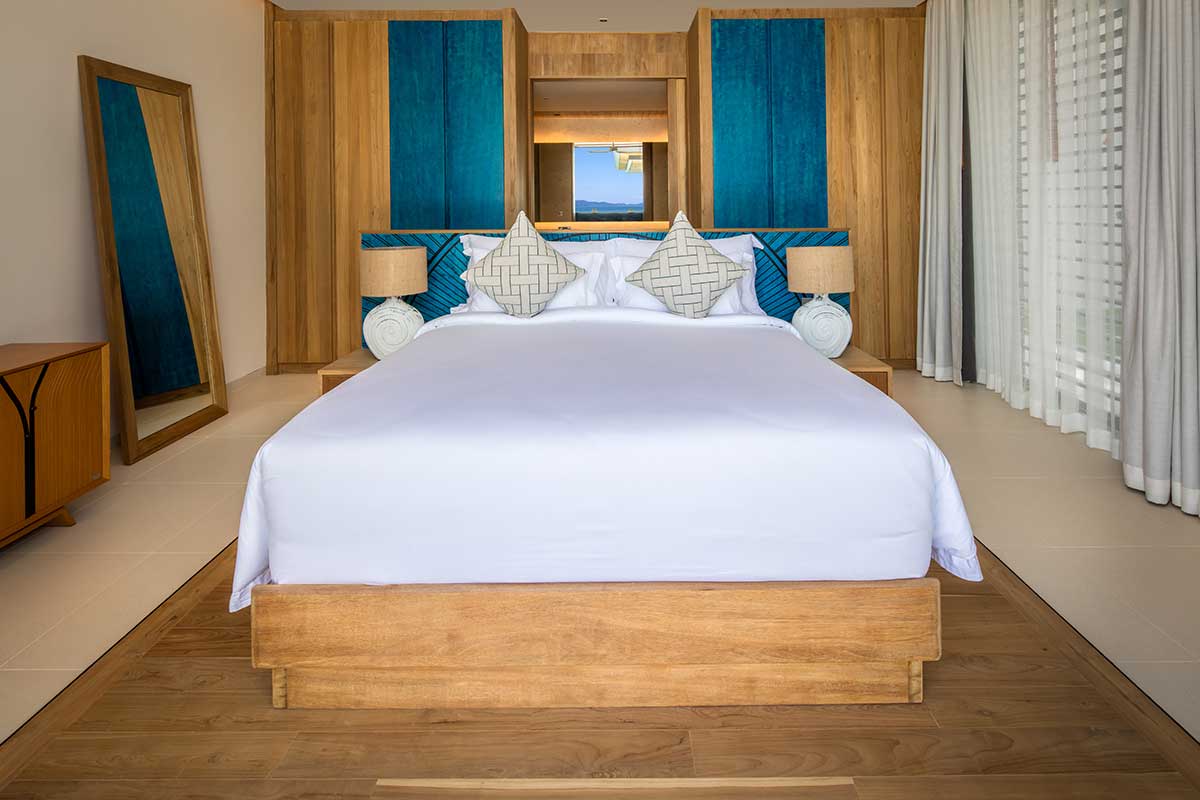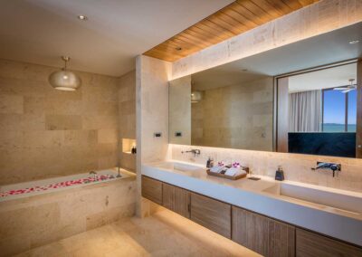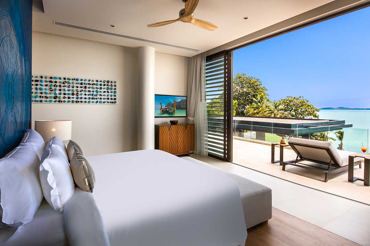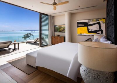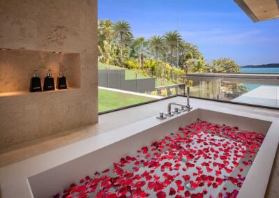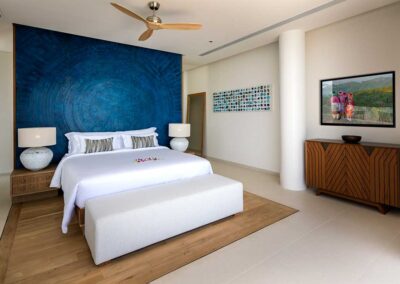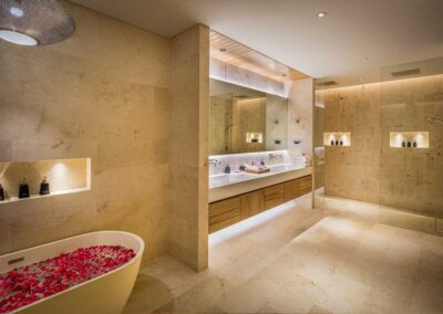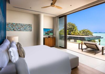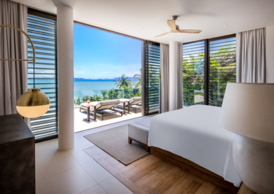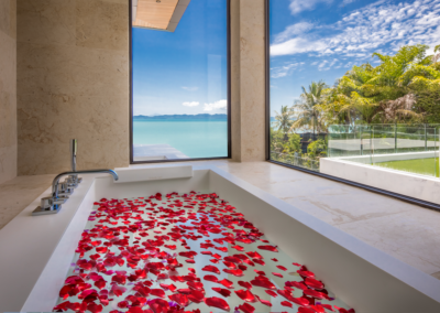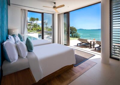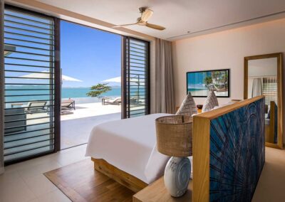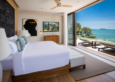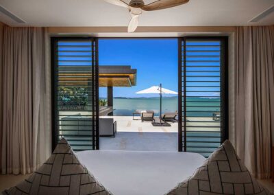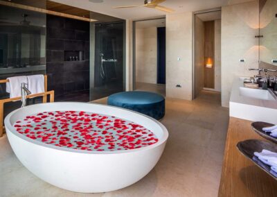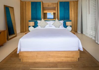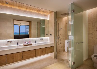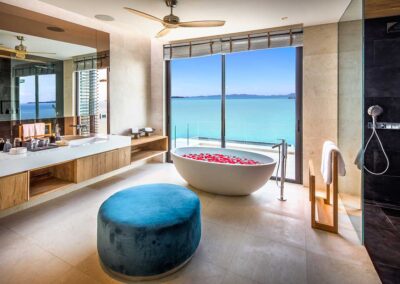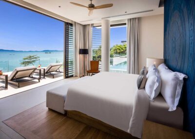 Guest Bedroom 7 (41 sqm) —King Size Bed; Panoramic Sea & Pool View; 50-Inch SMART flat screen TV; Her and Him Closets; Air-conditioning; Ceiling fan; Safety Box; Intercom; Ensuite with Hansgrohe Bathtub & Shower, Hansgrohe Rain Shower & Shower, Double Vanities, and separate toilet; Toiletries; Marvel shaving mirror; Hairdryer; Bathrobes; Slippers; Umbrellas