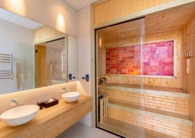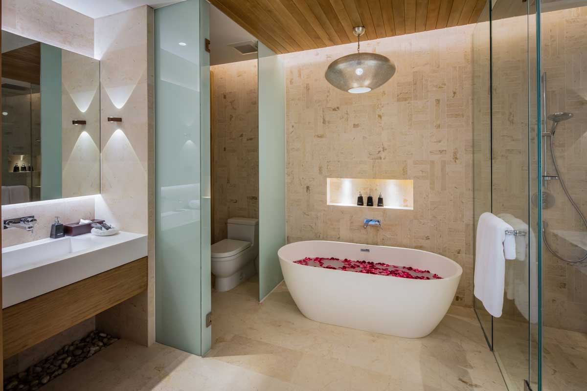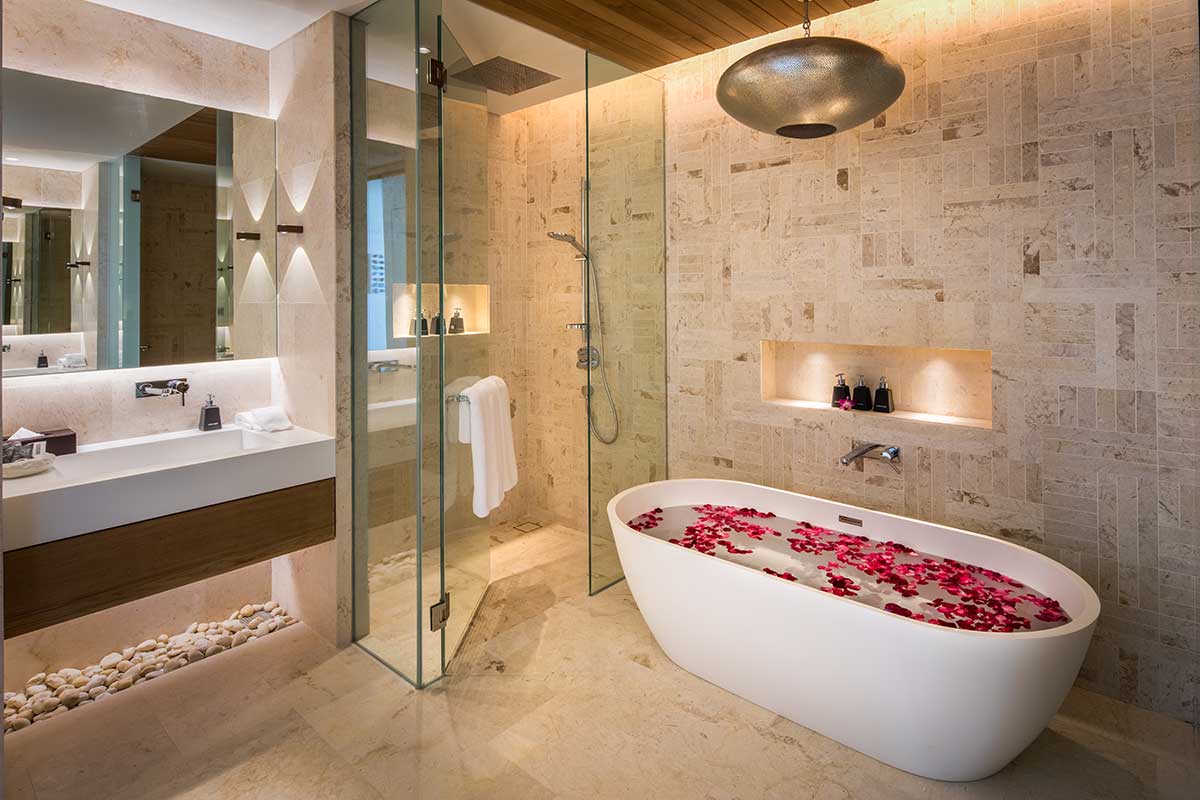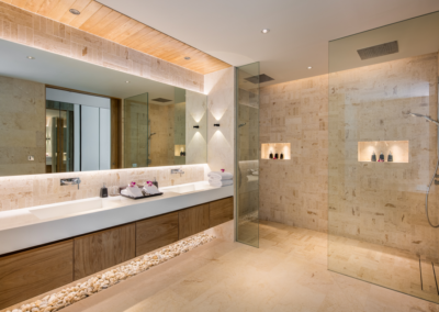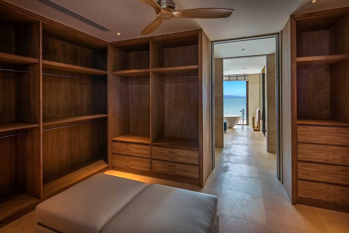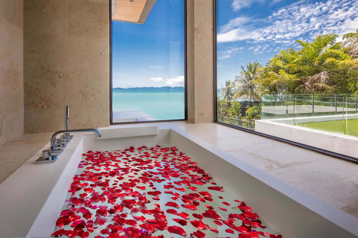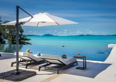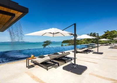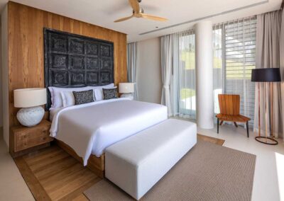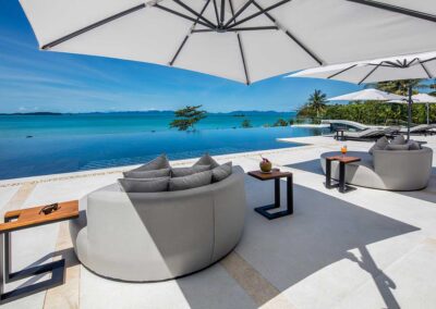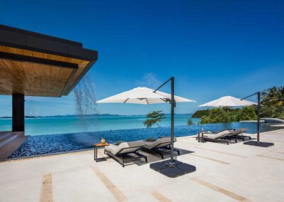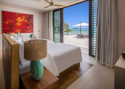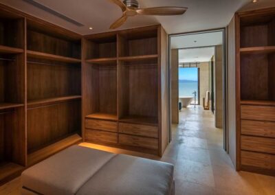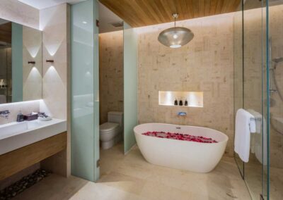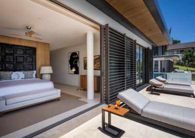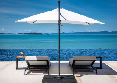Guest Bedroom 7 (41 sqm) —King Size Bed; Panoramic Sea & Pool View; 50-Inch SMART flat screen TV; Her and Him Closets; Air-conditioning; Ceiling fan; Safety Box; Intercom; Ensuite with Hansgrohe Bathtub & Shower, Hansgrohe Rain Shower & Shower, Double Vanities, and separate toilet; Toiletries; Marvel shaving mirror; Hairdryer; Bathrobes; Slippers; Umbrellas
