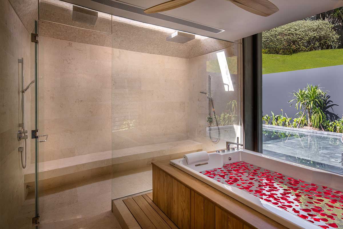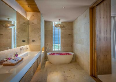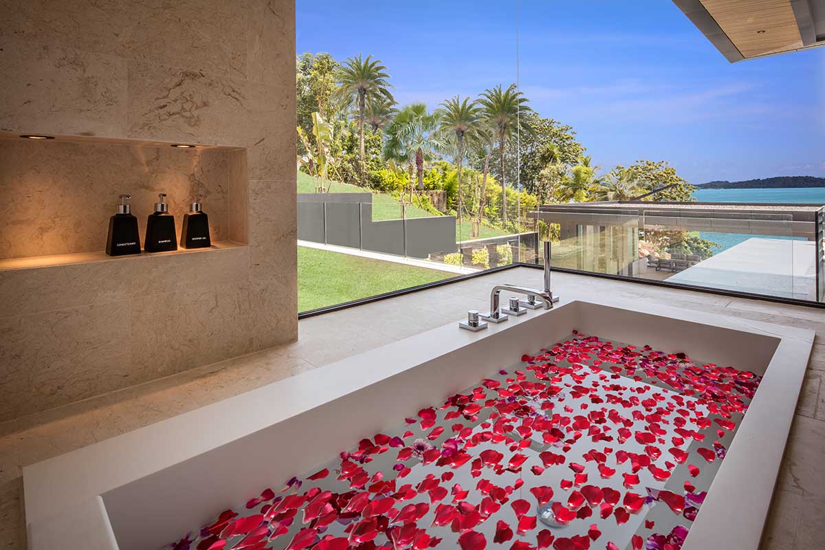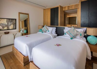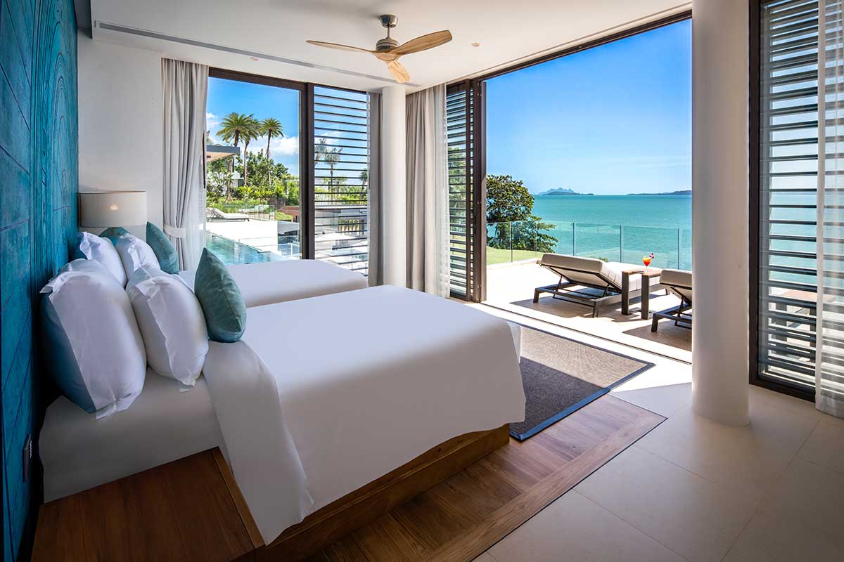 Guest Bedroom 6 (41 sqm) —King Size Bed or 2 Single Beds; Panoramic Sea & Pool View; 50-Inch SMART flat screen TV; Her and Him Closest; Air-conditioning; Ceiling fan; Safety Box; Intercom; Ensuite with Antonio Lupi Bathtub & Shower, Hansgrohe Rain Shower & Shower, Double Vanities, and separate toilet; Toiletries; Marvel shaving mirror; Hairdryer; Bathrobes; Slippers; Umbrellas