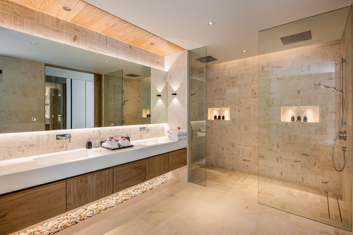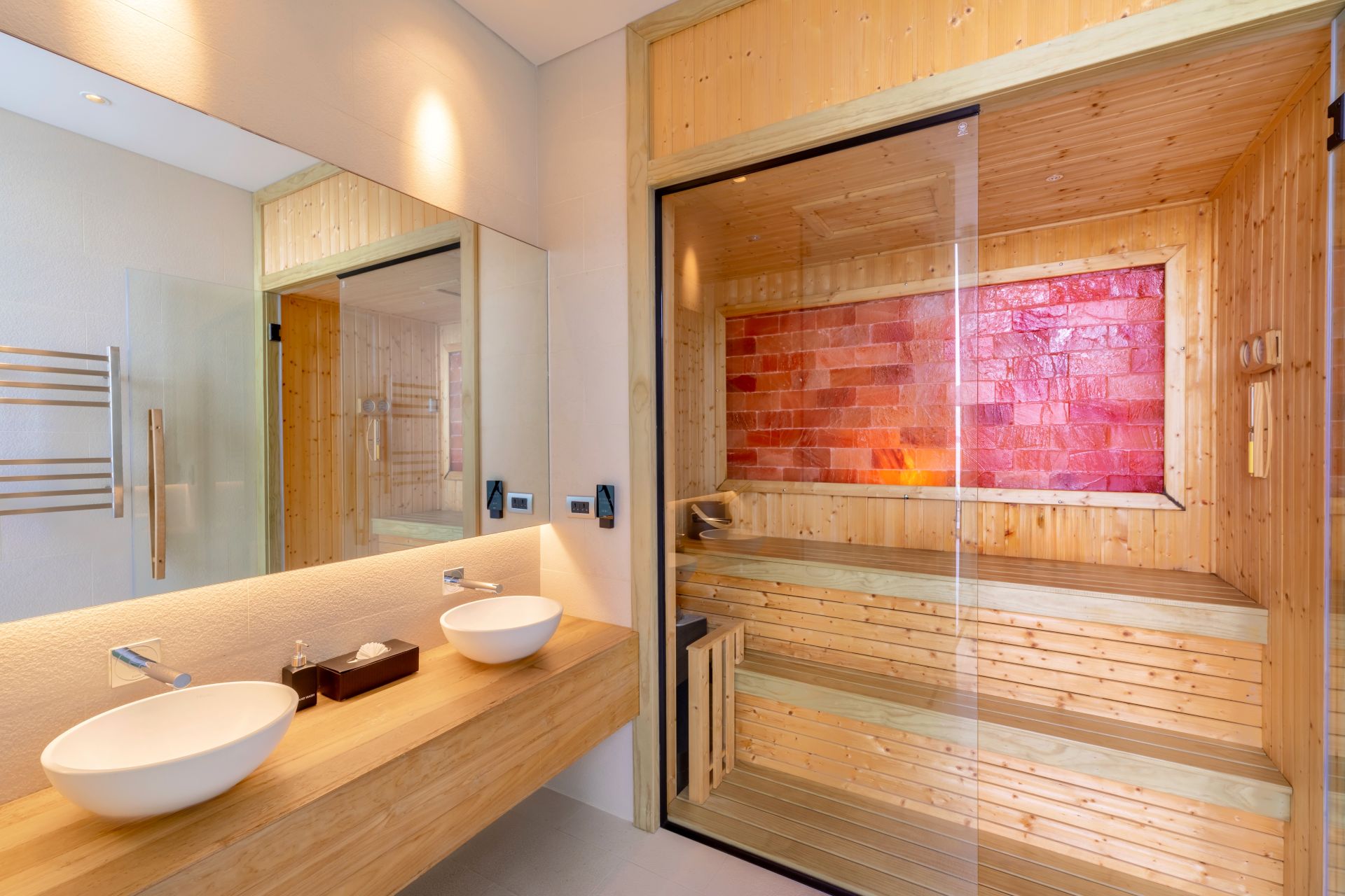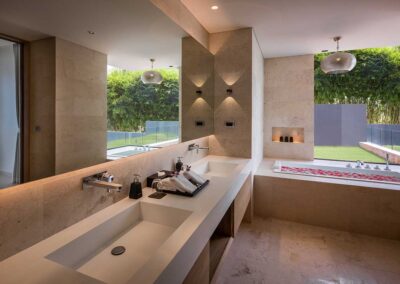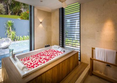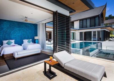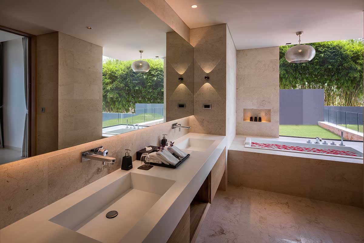 Guest Bedroom 6 (41 sqm) —King Size Bed or 2 Single Beds; Panoramic Sea & Pool View; 50-Inch SMART flat screen TV; Her and Him Closest; Air-conditioning; Ceiling fan; Safety Box; Intercom; Ensuite with Antonio Lupi Bathtub & Shower, Hansgrohe Rain Shower & Shower, Double Vanities, and separate toilet; Toiletries; Marvel shaving mirror; Hairdryer; Bathrobes; Slippers; Umbrellas