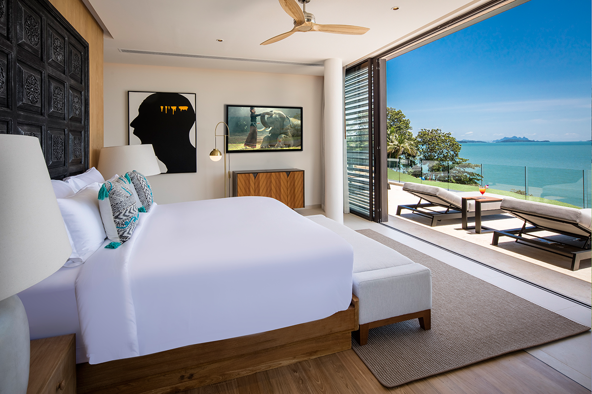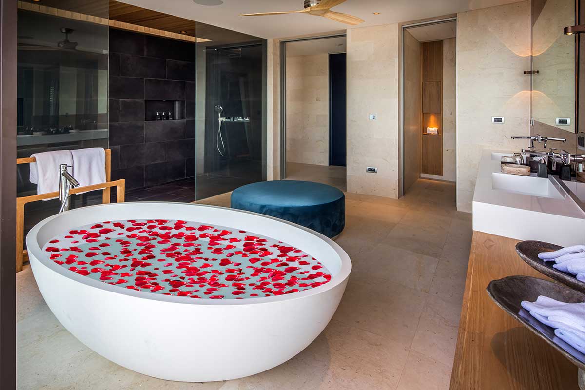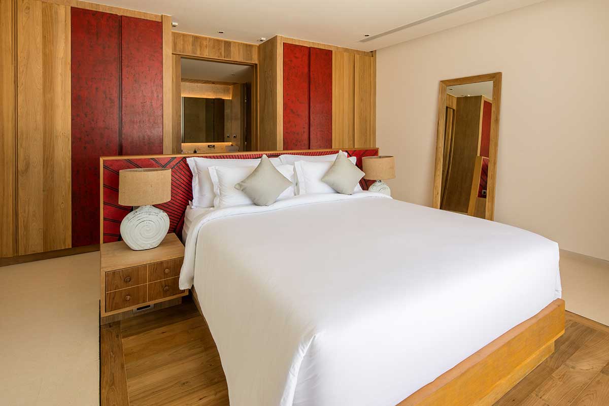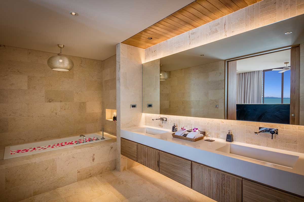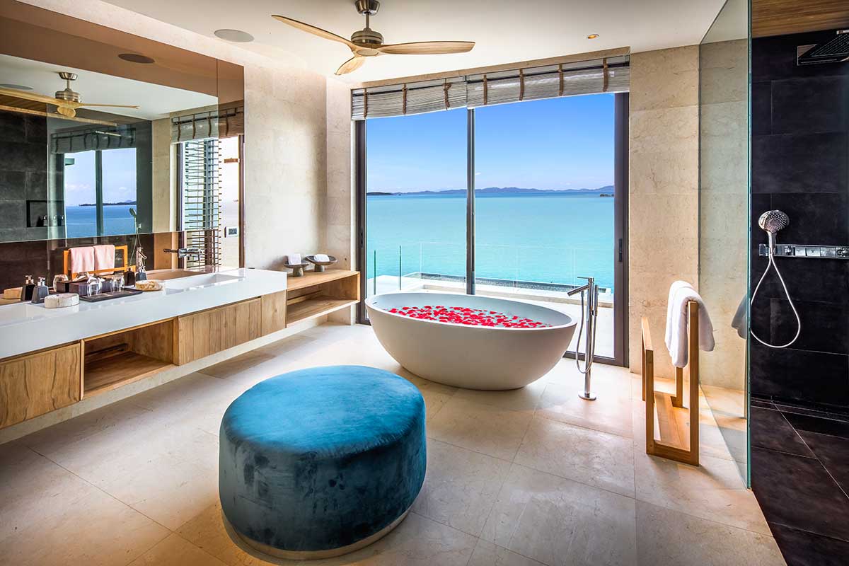 Master Bedroom (138 sqm)—Super king size bed (width 310cm); Panoramic Sea View; Seating area for 5 persons; 50-Inch SMART flat screen TV; SONOS Sound System; Intercom; Walk-in closet with stool; Air-conditioning; Ceiling fan; Safety deposit box; Ensuite with Ovale Bathtub & Shower, Double Hansgrohe Rain showers, Double vanities, and separate toilet; Toiletries; Marvel shaving mirror; Hairdryer; Bathrobes; Slippers; Umbrellas