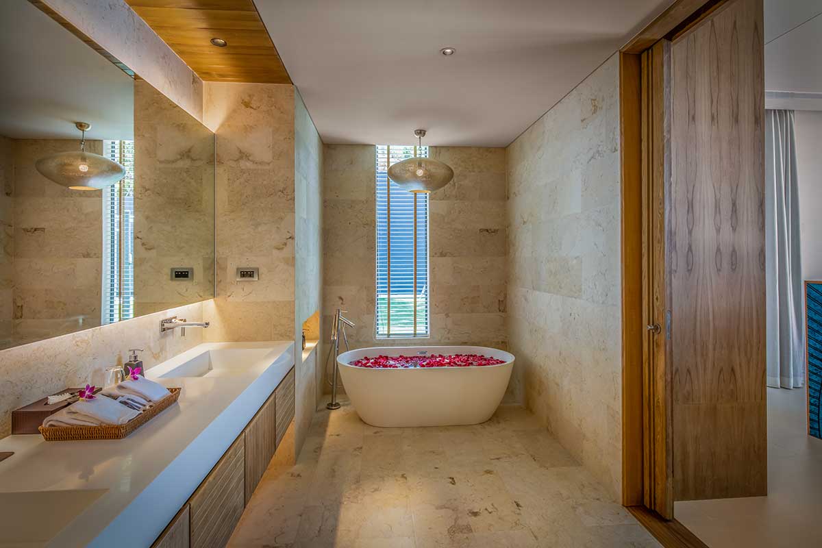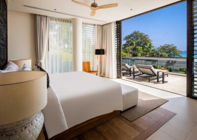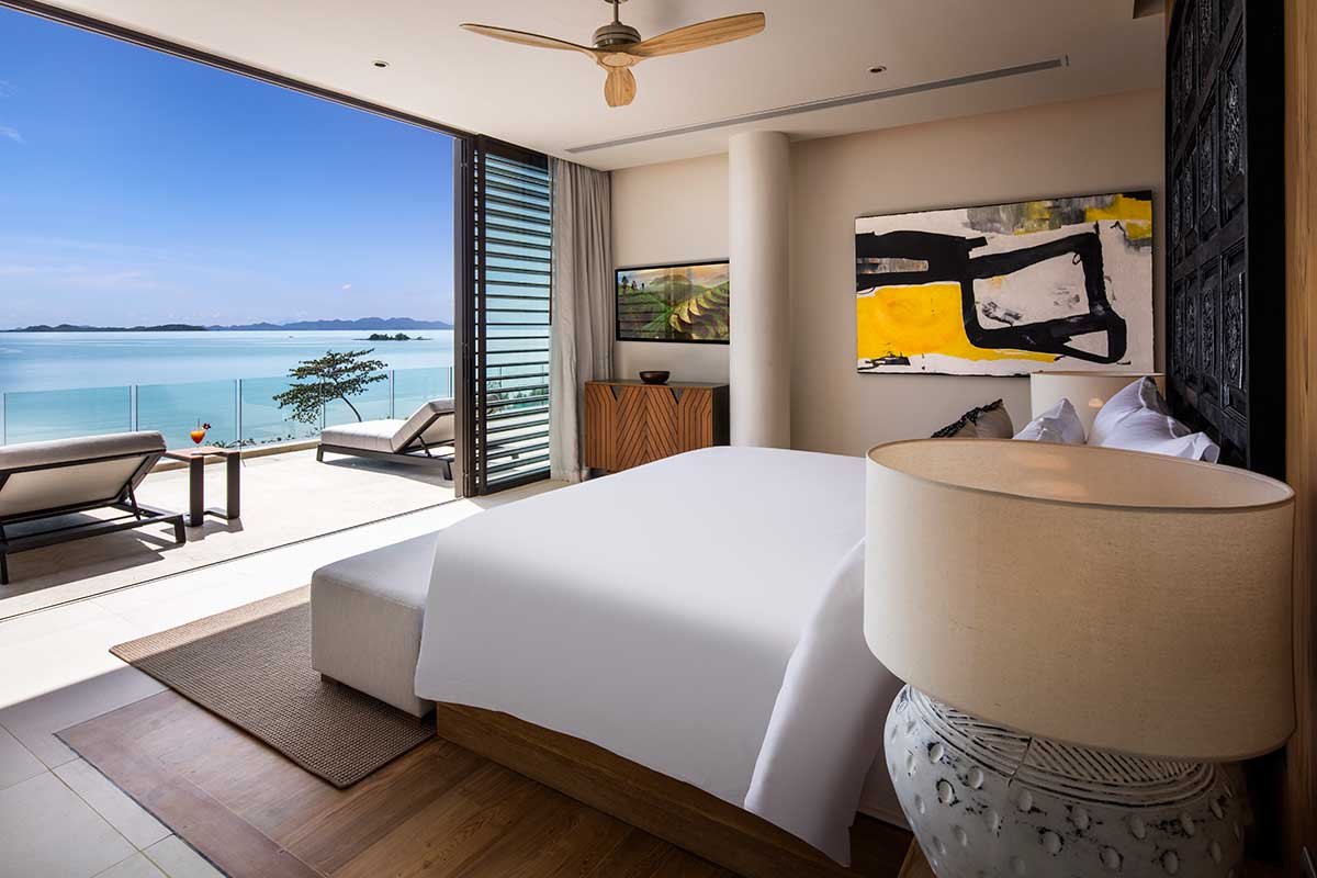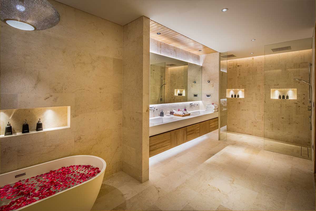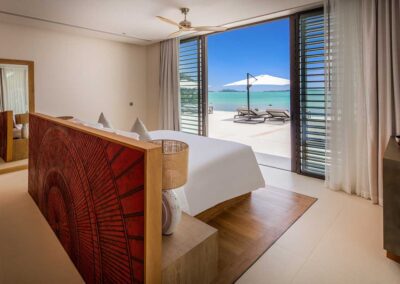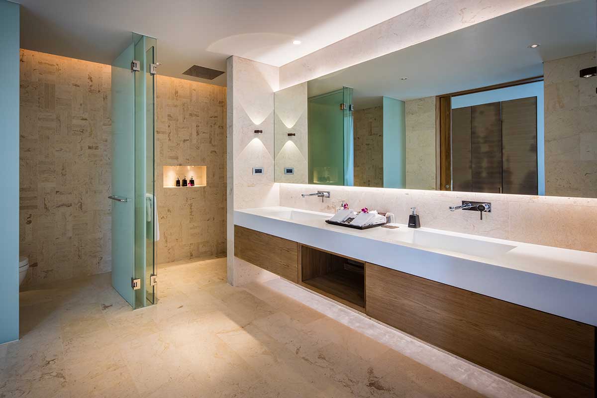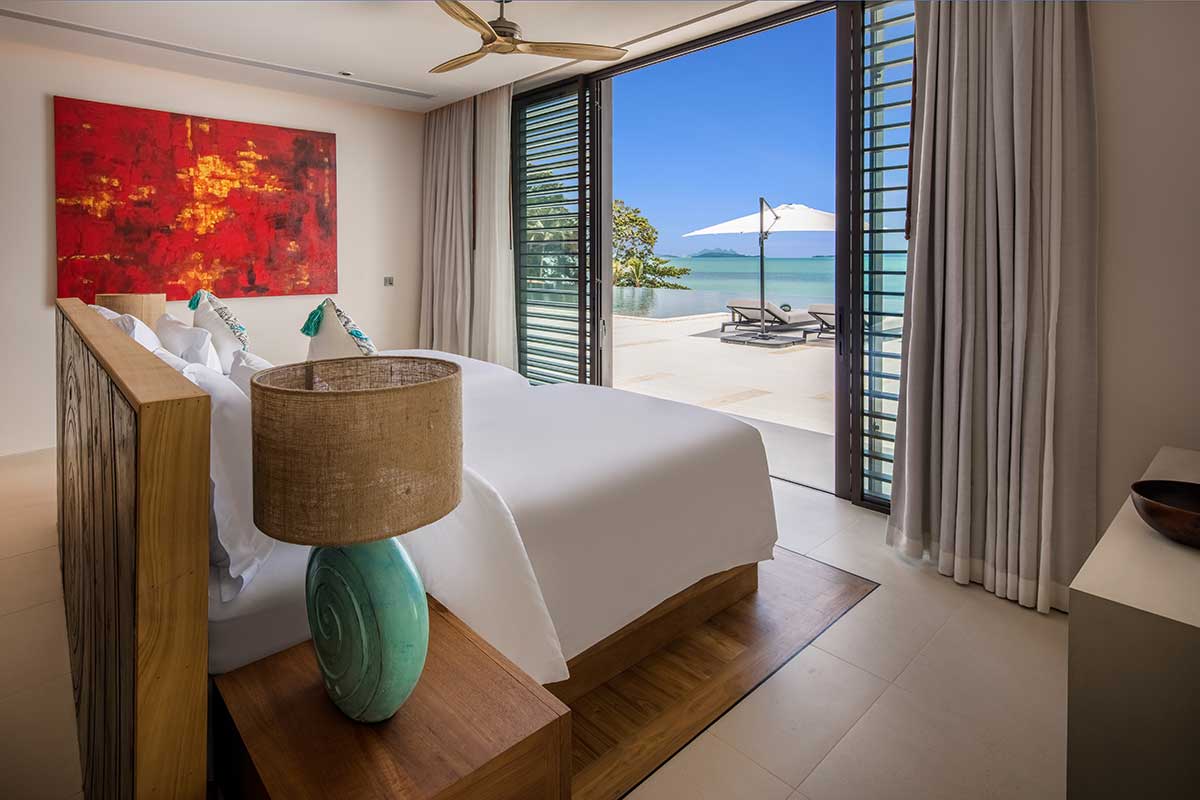 Master Bedroom (138 sqm)—Super king size bed (width 310cm); Panoramic Sea View; Seating area for 5 persons; 50-Inch SMART flat screen TV; SONOS Sound System; Intercom; Walk-in closet with stool; Air-conditioning; Ceiling fan; Safety deposit box; Ensuite with Ovale Bathtub & Shower, Double Hansgrohe Rain showers, Double vanities, and separate toilet; Toiletries; Marvel shaving mirror; Hairdryer; Bathrobes; Slippers; Umbrellas