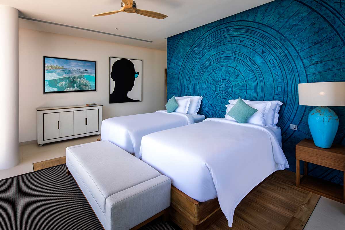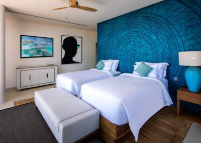 Guest Bedroom 2 (75 sqm) —King Size Bed or 2 Single Beds; Panoramic Sea View; Access to the Mid-Level Pool; Large Balcony with 2 Sunbeds; 50-Inch SMART flat screen TV; Her and Him Closest; Air-conditioning; Ceiling fan; Safety Box; Intercom; Ensuite with Hansgrohe Bathtub, Hansgrohe Rain Shower & Shower, Double Vanities, and separate toilet; Toiletries; Marvel shaving mirror; Hairdryer; Bathrobes; Slippers; Umbrellas