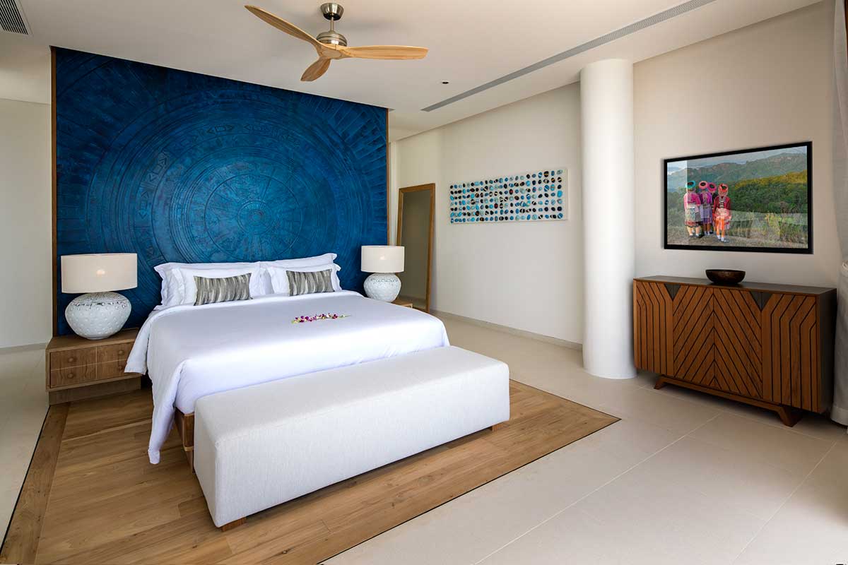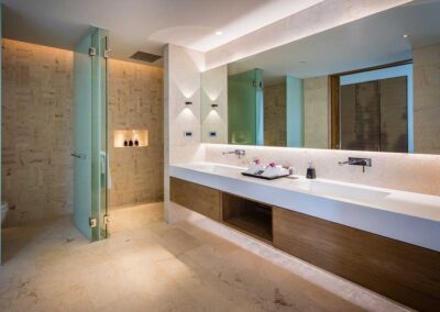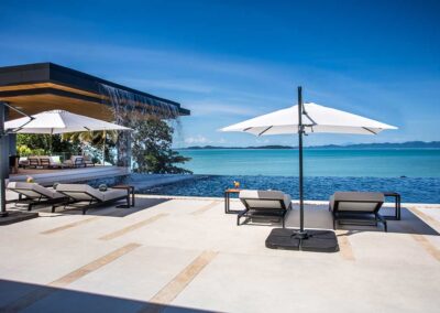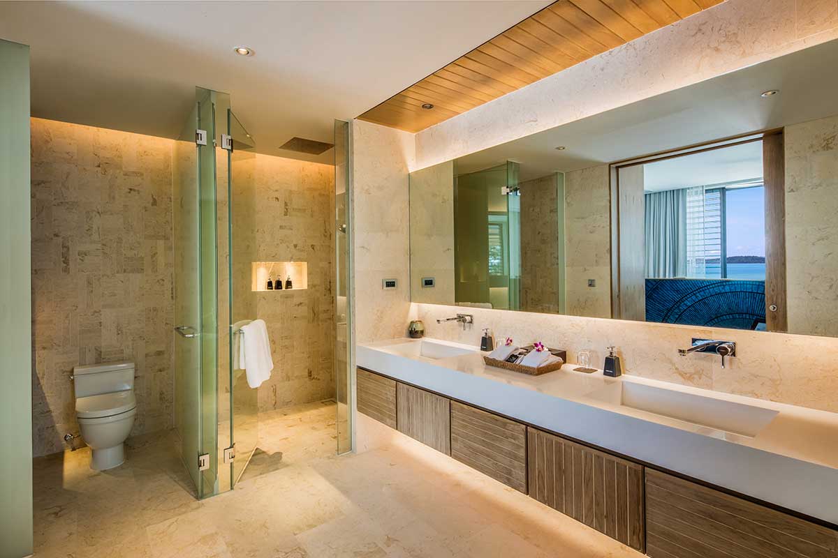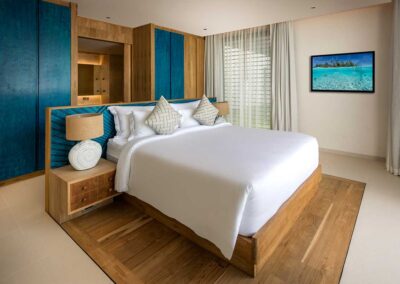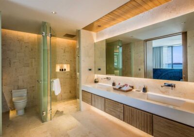 Guest Bedroom 3 (75 sqm) —King Size Bed; Panoramic Sea View; Access to the Mid-Level Pool; Large Balcony with 2 Sunbeds; 50-Inch SMART flat screen TV; Her and Him Closest; Air-conditioning; Ceiling fan; Safety Box; Intercom; Ensuite with Hansgrohe Bathtub, Hansgrohe Rain Shower & Shower, Double Vanities, and separate toilet; Toiletries; Marvel shaving mirror; Hairdryer; Bathrobes; Slippers; Umbrellas